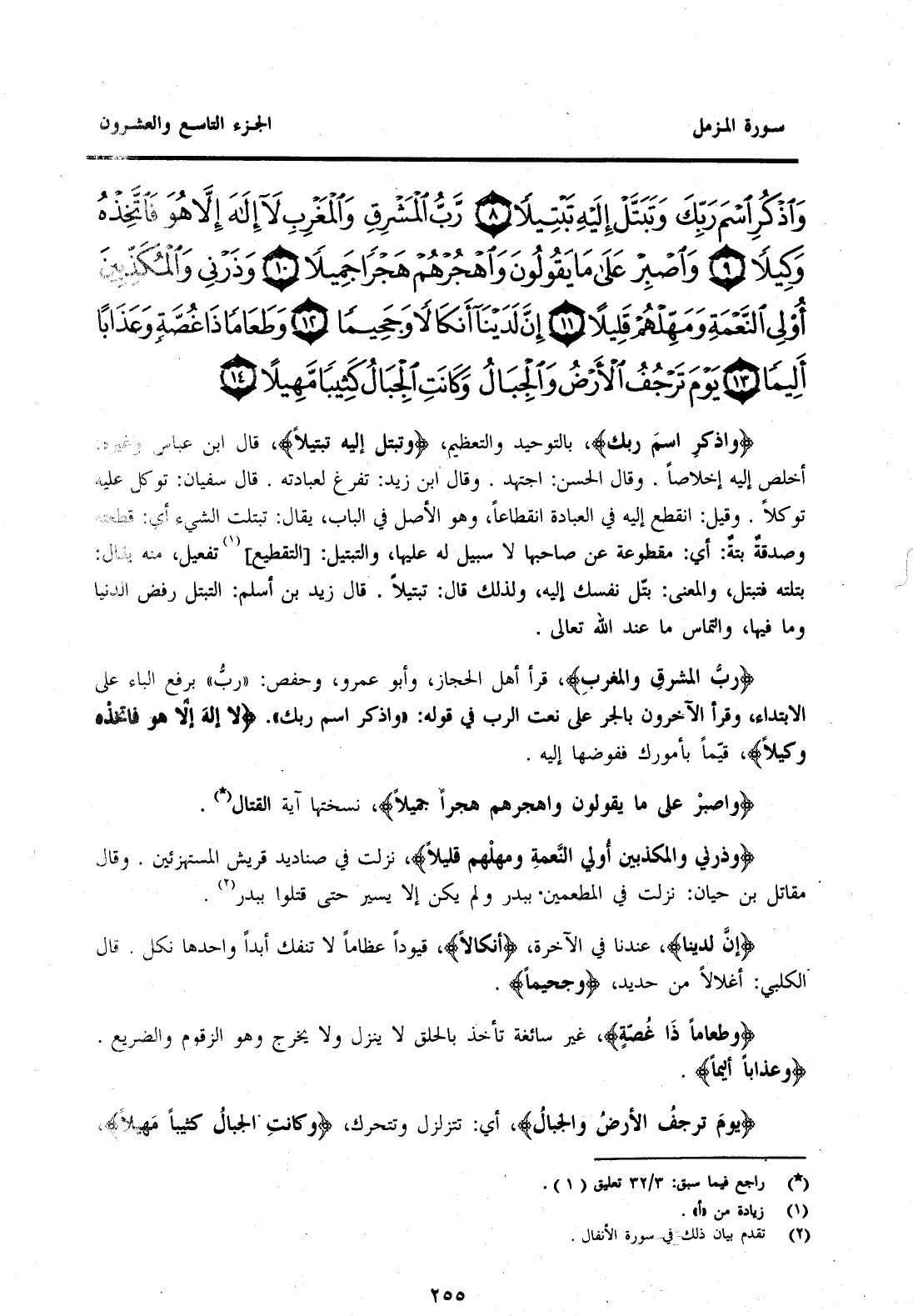 {وَاذْكُرِ اسْمَ رَبِّكَ وَتَبَتَّلْ إِلَيْهِ تَبْتِيلًا (8) رَبُّ الْمَشْرِقِ وَالْمَغْرِبِ لَا إِلَهَ إِلَّا هُوَ فَاتَّخِذْهُ وَكِيلًا (9) وَاصْبِرْ عَلَى مَا يَقُولُونَ وَاهْجُرْهُمْ هَجْرًا جَمِيلًا (10) وَذَرْنِي وَالْمُكَذِّبِينَ أُولِي النَّعْمَةِ وَمَهِّلْهُمْ قَلِيلًا (11) إِنَّ لَدَيْنَا أَنْكَالًا وَجَحِيمًا (12) وَطَعَامًا ذَا غُصَّةٍ وَعَذَابًا أَلِيمًا (13) يَوْمَ تَرْجُفُ الْأَرْضُ وَالْجِبَالُ وَكَانَتِ الْجِبَالُ كَثِيبًا مَهِيلًا (14) }