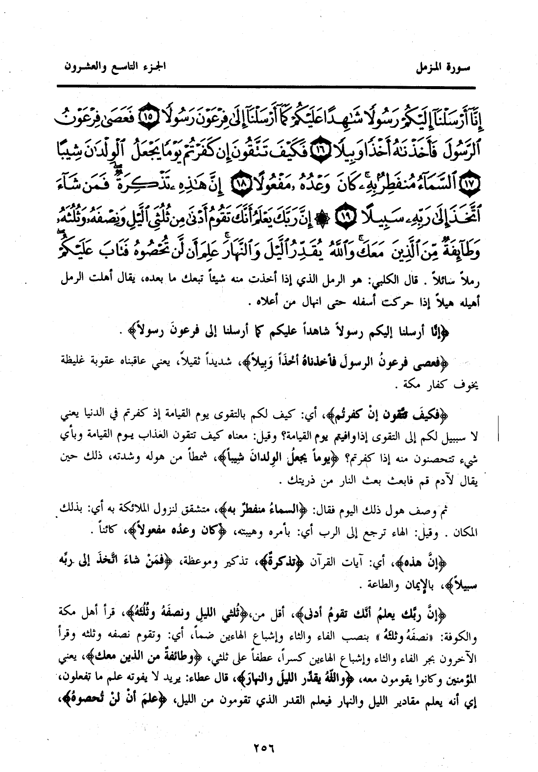 {فَعَصَى فِرْعَوْنُ الرَّسُولَ فَأَخَذْنَاهُ أَخْذًا وَبِيلًا} ، شَدِيدًا ثَقِيلًا يَعْنِي عَاقَبْنَاهُ عُقُوبَةً غَلِيظَةً يُخَوِّفُ كُفَّارَ مَكَّةَ. {فَكَيْفَ تَتَّقُونَ إِنْ كَفَرْتُمْ} أَيْ: كَيْفَ لَكُمْ بِالتَّقْوَى يَوْمَ الْقِيَامَةِ إِذْ كَفَرْتُمْ فِي الدُّنْيَا يَعْنِي لَا سَبِيلَ لَكُمْ إِلَى التَّقْوَى إِذَا وَافَيْتُمْ يَوْمَ الْقِيَامَةِ؟ وَقِيلَ: مَعْنَاهُ كَيْفَ تَتَّقُونَ الْعَذَابَ يَوْمَ الْقِيَامَةِ وَبِأَيِّ شَيْءٍ تَتَحَصَّنُونَ مِنْهُ إِذَا كَفَرْتُمْ؟ {يَوْمًا يَجْعَلُ الْوِلْدَانَ شِيبًا} شُمْطًا مِنْ هَوْلِهِ وَشِدَّتِهِ، ذَلِكَ حِينَ يُقَالُ لِآدَمَ قُمْ فَابْعَثْ بَعْثَ النَّارِ مِنْ ذُرِّيَّتِكَ. ثُمَّ وَصَفَ هَوْلَ ذَلِكَ الْيَوْمَ فَقَالَ: {السَّمَاءُ مُنْفَطِرٌ بِهِ} مُتَشَقِّقٌ لِنُزُولِ الْمَلَائِكَةِ بِهِ أَيْ: بِذَلِكَ الْمَكَانِ. وَقِيلَ: الْهَاءُ تَرْجِعُ إِلَى الرَّبِّ أَيْ: بِأَمْرِهِ وَهَيْبَتِهِ {كَانَ وَعْدُهُ مَفْعُولًا} كَائِنًا. {إِنَّ هَذِهِ} أَيْ: آيَاتِ الْقُرْآنِ {تَذْكِرَةٌ} تَذْكِيرٌ وَمَوْعِظَةٌ {فَمَنْ شَاءَ اتَّخَذَ إِلَى رَبِّهِ سَبِيلًا} بِالْإِيمَانِ وَالطَّاعَةِ. {إِنَّ رَبَّكَ يَعْلَمُ أَنَّكَ تَقُومُ أَدْنَى} أَقَلَّ مِنْ {ثُلُثَيِ اللَّيْلِ وَنِصْفَهُ وَثُلُثَهُ} قَرَأَ أَهْلُ مَكَّةَ وَالْكُوفَةَ: "نِصْفَهُ وَثُلُثَهُ" بِنَصْبِ الْفَاءِ وَالثَّاءِ وَإِشْبَاعِ الْهَاءَيْنِ ضَمًّا أَيْ: وَتَقُومُ نِصْفَهُ وَثُلْثَهُ وَقَرَأَ الْآخَرُونَ بِجَرِّ الْفَاءِ وَالثَّاءِ وَإِشْبَاعِ الْهَاءَيْنِ كَسْرًا عَطْفًا عَلَى ثُلْثِي {وَطَائِفَةٌ مِنَ الَّذِينَ مَعَكَ} يَعْنِي الْمُؤْمِنِينَ وَكَانُوا يَقُومُونَ مَعَهُ {وَاللَّهُ يُقَدِّرُ اللَّيْلَ وَالنَّهَارَ} قَالَ عَطَاءٌ: يُرِيدُ لَا يَفُوتُهُ عِلْمُ مَا تَفْعَلُونَ، أَيْ أَنَّهُ يَعْلَمُ مَقَادِيرَ اللَّيْلِ وَالنَّهَارِ فَيَعْلَمُ الْقَدْرَ الَّذِي تَقُومُونَ مِنَ اللَّيْلِ {عَلِمَ أَنْ لَنْ تُحْصُوهُ}