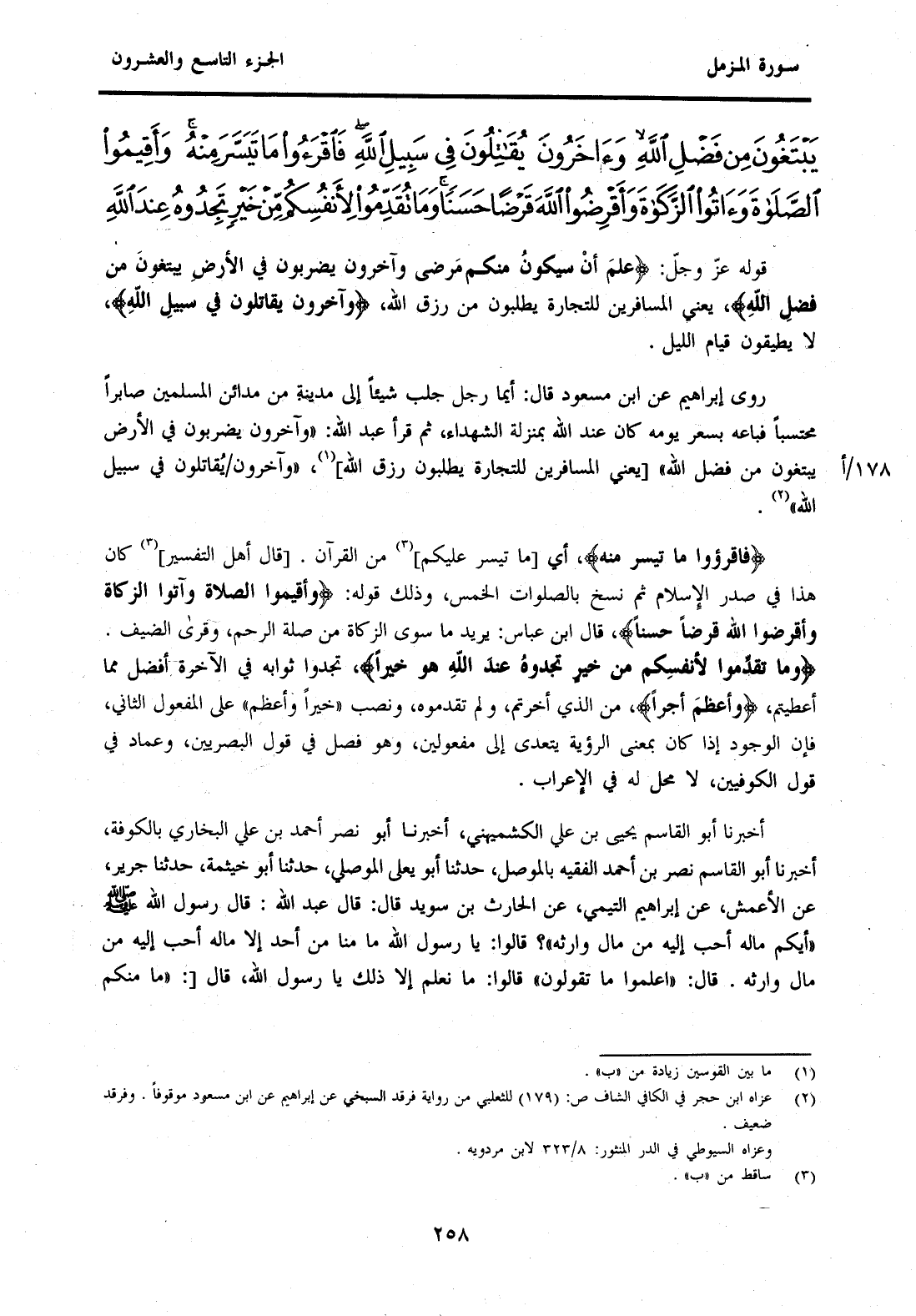 رَوَى إِبْرَاهِيمُ عَنِ ابْنِ مَسْعُودٍ قَالَ: أَيُّمَا رَجُلٍ جَلَبَ شَيْئًا إِلَى مَدِينَةٍ مِنْ مَدَائِنِ الْمُسْلِمِينَ صَابِرًا مُحْتَسِبًا فَبَاعَهُ بِسِعْرِ يَوْمِهِ كَانَ عِنْدَ اللَّهِ بِمَنْزِلَةِ الشُّهَدَاءِ ثُمَّ قَرَأَ عَبْدُ اللَّهِ: "وَآخَرُونَ يَضْرِبُونَ فِي الْأَرْضِ يَبْتَغُونَ مِنْ فَضْلِ اللَّهِ" [يَعْنِي الْمُسَافِرِينَ لِلتِّجَارَةِ يَطْلُبُونَ رِزْقَ الله] (1) "وآخرون 178/أيُقَاتِلُونَ فِي سَبِيلِ اللَّهِ" (2) .