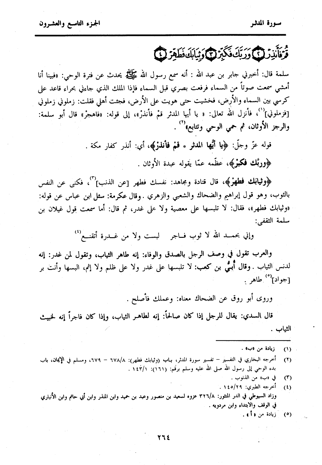 (2) أخرجه البخاري في التفسير - تفسير سورة المدثر، باب (وثيابك فطهر) : 8 / 678-679، ومسلم في الإيمان، باب بدء الوحي إلى رسول الله صَلَّى اللَّهُ عَلَيْهِ وَسَلَّمَ برقم (161) : 1 / 143.
