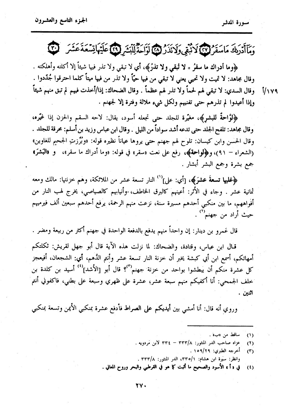 {وَمَا أَدْرَاكَ مَا سَقَرُ (27) لَا تُبْقِي وَلَا تَذَرُ (28) لَوَّاحَةٌ لِلْبَشَرِ (29) عَلَيْهَا تِسْعَةَ عَشَرَ (30) }