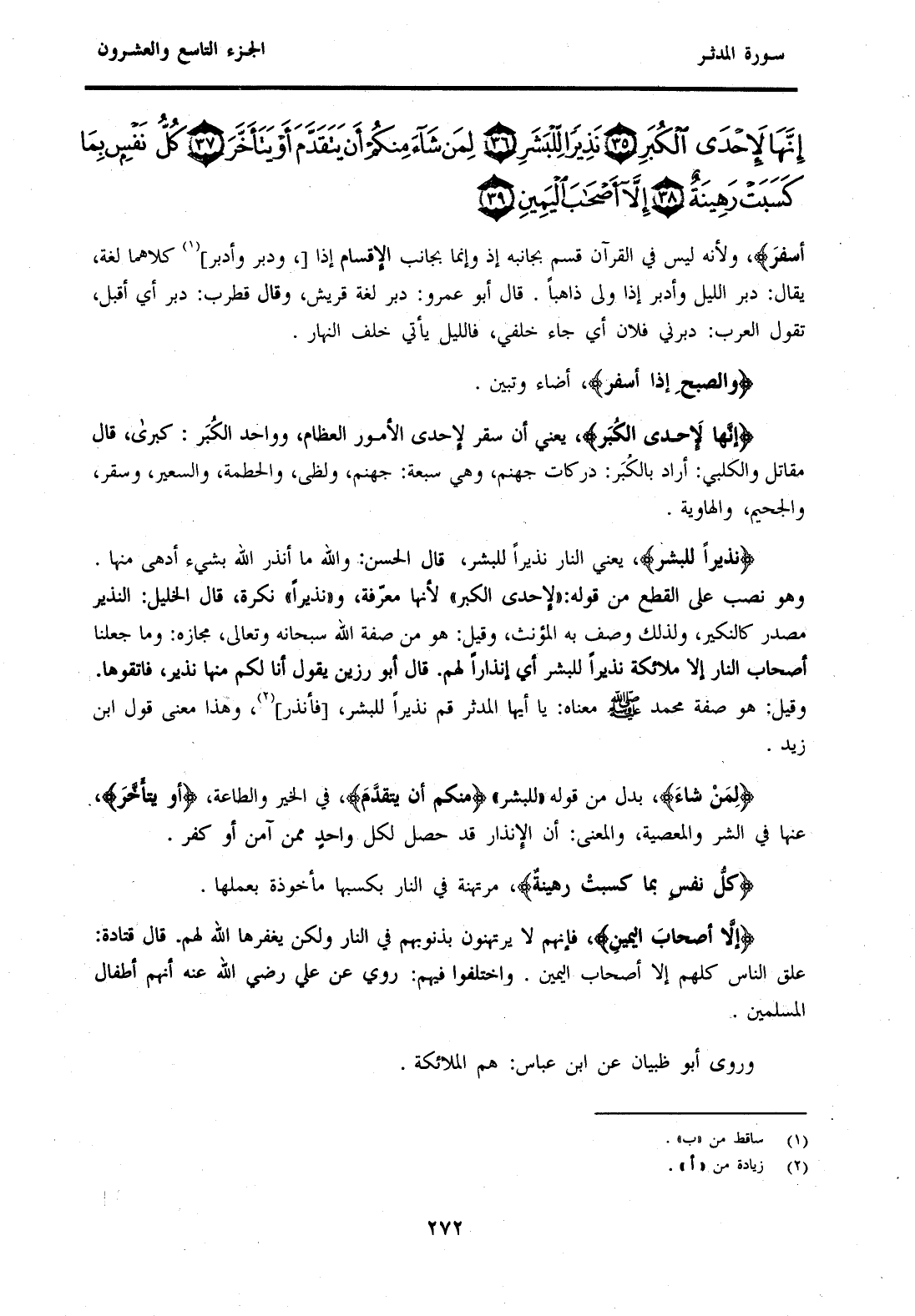 {إِنَّهَا لَإِحْدَى الْكُبَرِ} يَعْنِي أَنَّ سَقَرَ لَإِحْدَى الْأُمُورِ الْعِظَامِ، وَوَاحِدُ الْكُبَرِ: كُبْرَى، قَالَ مُقَاتِلٌ وَالْكَلْبِيُّ: أَرَادَ بِالْكُبَرِ: دَرَكَاتُ جَهَنَّمَ، وهي سبعة: جنهم، وَلَظَى، وَالْحُطَمَةُ، وَالسَّعِيرُ، وَسَقَرُ، وَالْجَحِيمُ، وَالْهَاوِيَةُ. {نَذِيرًا لِلْبَشَرِ} يَعْنِي النَّارَ نَذِيرًا لِلْبَشَرِ، قَالَ الْحَسَنُ: وَاللَّهِ مَا أَنْذَرَ اللَّهُ بِشَيْءٍ أَدْهَى مِنْهَا، وَهُوَ نَصْبٌ عَلَى الْقَطْعِ مِنْ قَوْلِهِ: "لَإِحْدَى الْكُبَرِ" لِأَنَّهَا مَعْرِفَةٌ، وَ"نَذِيرًا" نَكِرَةٌ، قَالَ الْخَلِيلُ: النَّذِيرُ مَصْدَرٌ كَالنَّكِيرِ، وَلِذَلِكَ وُصِفَ بِهِ الْمُؤَنَّثُ، وَقِيلَ: هُوَ مِنْ صِفَةِ اللَّهِ سُبْحَانَهُ وَتَعَالَى، مَجَازُهُ: وَمَا جَعَلْنَا أَصْحَابَ النَّارِ إِلَّا مَلَائِكَةً نَذِيرًا لِلْبَشَرِ أَيْ إِنْذَارًا لَهُمْ. قَالَ أَبُو رُزَيْنٍ يَقُولُ أَنَا لَكُمْ مِنْهَا نَذِيرٌ، فَاتَّقُوهَا. وَقِيلَ: هُوَ صِفَةُ مُحَمَّدٍ صَلَّى اللَّهُ عَلَيْهِ وَسَلَّمَ مَعْنَاهُ: يَا أَيُّهَا الْمُدَّثِّرُ قُمْ نَذِيرًا لِلْبَشَرِ، [فَأَنْذِرْ] (2) وَهَذَا مَعْنَى قَوْلِ ابْنِ زَيْدٍ. {لِمَنْ شَاءَ} بَدَلٌ مِنْ قَوْلِهِ "لِلْبَشَرِ" {مِنْكُمْ أَنْ يَتَقَدَّمَ} فِي الْخَيْرِ وَالطَّاعَةِ {أَوْ يَتَأَخَّرَ} عَنْهَا فِي الشَّرِّ وَالْمَعْصِيَةِ، وَالْمَعْنَى: أَنَّ الْإِنْذَارَ قَدْ حَصَلَ لِكُلِّ وَاحِدٍ مِمَّنْ آمَنَ أَوْ كَفَرَ. {كُلُّ نَفْسٍ بِمَا كَسَبَتْ رَهِينَةٌ} مُرْتَهِنَةٌ فِي النَّارِ بِكَسْبِهَا مَأْخُوذَةٌ بِعَمَلِهَا. {إِلَّا أَصْحَابَ الْيَمِينِ} فَإِنَّهُمْ لَا يَرْتَهِنُونَ بِذُنُوبِهِمْ فِي النَّارِ وَلَكِنْ يَغْفِرُهَا اللَّهُ لَهُمْ. قَالَ قَتَادَةُ: عَلَّقَ النَّاسَ كُلَّهُمْ إِلَّا أَصْحَابَ الْيَمِينِ. وَاخْتَلَفُوا فِيهِمْ: رُوِيَ عَنْ عَلِيٍّ رَضِيَ اللَّهُ عَنْهُ أَنَّهُمْ أَطْفَالُ الْمُسْلِمِينَ.