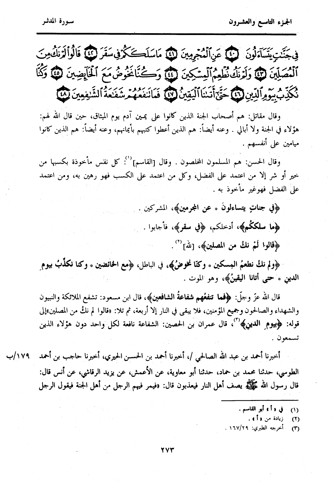 {فِي جَنَّاتٍ يَتَسَاءَلُونَ عَنِ الْمُجْرِمِينَ} الْمُشْرِكِينَ. {مَا سَلَكَكُمْ} أَدْخَلَكُمْ {فِي سَقَرَ} فَأَجَابُوا {قَالُوا لَمْ نَكُ مِنَ الْمُصَلِّينَ} [لِلَّهِ] (1) {وَلَمْ نَكُ نُطْعِمُ الْمِسْكِينَ وَكُنَّا نَخُوضُ} فِي الْبَاطِلِ {مَعَ الْخَائِضِينَ وَكُنَّا نُكَذِّبُ بِيَوْمِ الدِّينِ} {حَتَّى أَتَانَا الْيَقِينُ} وَهُوَ الْمَوْتُ. قَالَ اللَّهُ عَزَّ وَجَلَّ {فَمَا تَنْفَعُهُمْ شَفَاعَةُ الشَّافِعِينَ} قَالَ ابْنُ مَسْعُودٍ: تَشْفَعُ الْمَلَائِكَةُ وَالنَّبِيُّونَ وَالشُّهَدَاءُ وَالصَّالِحُونَ وَجَمِيعُ الْمُؤْمِنِينَ، فَلَا يَبْقَى فِي النَّارِ إِلَّا أَرْبَعَةٌ، ثُمَّ تَلَا "قَالُوا لَمْ نَكُ مِنَ الْمُصَلِّينَ" إِلَى قَوْلِهِ: {بِيَوْمِ الدِّينِ} (2) قَالَ عِمْرَانُ بْنُ الْحُصَيْنِ: الشَّفَاعَةُ نَافِعَةٌ لِكُلِّ وَاحِدٍ دُونَ هَؤُلَاءِ الَّذِينَ تَسْمَعُونَ.
