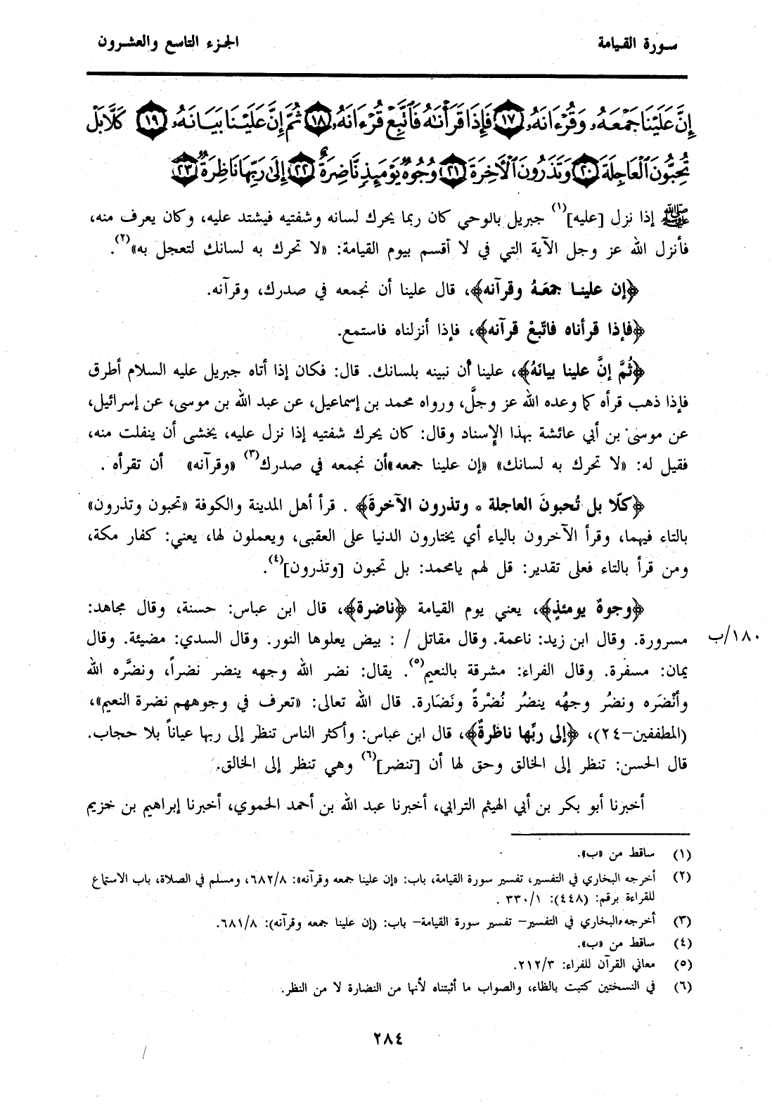 {إِنَّ عَلَيْنَا جَمْعَهُ وَقُرْآنَهُ} قَالَ عَلَيْنَا أَنْ نَجْمَعَهُ فِي صَدْرِكَ، وَقُرْآنَهُ. {فَإِذَا قَرَأْنَاهُ فَاتَّبِعْ قُرْآنَهُ} فَإِذَا أَنْزَلْنَاهُ فَاسْتَمِعْ. {ثُمَّ إِنَّ عَلَيْنَا بَيَانَهُ} عَلَيْنَا أَنْ نُبَيِّنَهُ بِلِسَانِكَ. قَالَ: فَكَانَ إِذَا أَتَاهُ جِبْرِيلُ عَلَيْهِ السَّلَامُ أَطْرَقَ فَإِذَا ذَهَبَ قَرَأَهُ كَمَا وَعَدَهُ اللَّهُ عَزَّ وَجَلَّ، وَرَوَاهُ مُحَمَّدُ بْنُ إِسْمَاعِيلَ، عَنْ عَبْدِ اللَّهِ بْنِ مُوسَى، عَنْ إِسْرَائِيلَ، عَنْ مُوسَى بْنِ أَبِي عَائِشَةَ بِهَذَا الْإِسْنَادِ وَقَالَ: كَانَ يُحَرِّكُ شَفَتَيْهِ إِذَا نَزَلَ عَلَيْهِ، يَخْشَى أَنْ يَنْفَلِتَ مِنْهُ، فَقِيلَ لَهُ: "لَا تُحَرِّكْ بِهِ لِسَانَكَ" "إِنَّ عَلَيْنَا جَمْعَهُ" أَنْ نَجْمَعَهُ فِي صَدْرِكَ (1) "وَقُرْآنَهُ" أَنْ تَقْرَأَهُ. {كَلَّا بَلْ تُحِبُّونَ الْعَاجِلَةَ وَتَذَرُونَ الْآخِرَةَ} قَرَأَ أَهْلُ الْمَدِينَةِ وَالْكُوفَةِ "تُحْبُّونَ وَتَذَرُونَ" بِالتَّاءِ فِيهِمَا، وَقَرَأَ الْآخَرُونَ بِالْيَاءِ أَيْ يَخْتَارُونَ الدُّنْيَا عَلَى الْعُقْبَى، وَيَعْمَلُونَ لَهَا، يَعْنِي: كَفَّارَ مَكَّةَ، وَمَنْ قَرَأَ بِالتَّاءِ فَعَلَى تَقْدِيرِ: قُلْ لَهُمْ يَا مُحَمَّدُ: بَلْ تُحِبُّونَ [وَتَذَرُونَ] (2) {وُجُوهٌ يَوْمَئِذٍ} يَعْنِي يَوْمَ الْقِيَامَةِ {نَاضِرَةٌ} قَالَ ابْنُ عَبَّاسٍ: حَسَنَةٌ، وَقَالَ مُجَاهِدٌ: مَسْرُورَةٌ. وَقَالَ ابْنُ زَيْدٍ: نَاعِمَةٌ. وقال مقاتل: 180/ب بِيضٌ يَعْلُوهَا النُّورُ. وَقَالَ السُّدِّيُّ: مُضِيئَةٌ. وَقَالَ يَمَانٌ: مُسْفِرَةٌ. وَقَالَ الْفَرَّاءُ: مُشْرِقَةٌ بِالنَّعِيمِ (3) يُقَالُ: نَضَّرَ اللَّهُ وَجْهَهُ يُنَضِّرُ نَضْرًا، وَنَضَّرَهُ اللَّهُ وَأَنْضَرَهُ وَنَضُرَ وَجْهُهُ يَنْضُرُ نَضْرَةً وَنَضَارَةً. قَالَ اللَّهُ تَعَالَى: "تَعْرِفُ فِي وُجُوهِهِمْ نَضْرَةَ النَّعِيمِ" (الْمُطَفِّفِينَ-24) {إِلَى رَبِّهَا نَاظِرَةٌ} قَالَ ابْنُ عَبَّاسٍ: وَأَكْثَرُ النَّاسِ تَنْظُرُ إِلَى رَبِّهَا عَيَانًا بِلَا حِجَابٍ. قَالَ الْحَسَنُ: تَنْظُرُ إِلَى الْخَالِقِ وَحُقَّ لَهَا أَنْ [تَنْضُرَ] (4) وَهِيَ تَنْظُرُ إِلَى الْخَالِقِ.