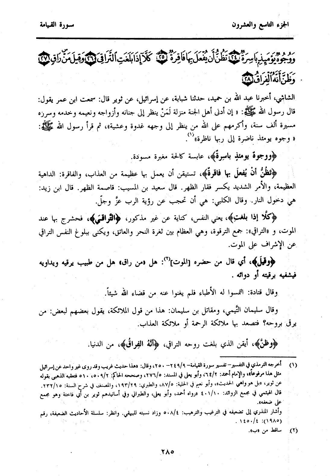 {وَوُجُوهٌ يَوْمَئِذٍ بَاسِرَةٌ} عَابِسَةٌ كَالِحَةٌ مُغْبَرَّةٌ مُسَوَّدَةٌ. {تَظُنُّ أَنْ يُفْعَلَ بِهَا فَاقِرَةٌ} تَسْتَيْقِنُ أَنْ يُعْمَلَ بِهَا عَظِيمَةٌ مِنَ الْعَذَابِ، وَالْفَاقِرَةُ: الدَّاهِيَةُ الْعَظِيمَةُ، وَالْأَمْرُ الشَّدِيدُ يَكْسِرُ فَقَارَ الظَّهْرِ. قَالَ سَعِيدُ بْنُ الْمُسَيَّبِ: قَاصِمَةُ الظَّهْرِ. قَالَ ابْنُ زَيْدٍ: هِيَ دُخُولُ النَّارِ. وَقَالَ الْكَلْبِيُّ: هِيَ أَنْ تُحْجَبَ عَنْ رُؤْيَةِ الرَّبِّ عَزَّ وَجَلَّ. {كَلَّا إِذَا بَلَغَتِ} يَعْنِي النَّفْسَ، كِنَايَةٌ عَنْ غَيْرِ مَذْكُورٍ {التَّرَاقِيَ} فَحَشْرَجَ بِهَا عِنْدَ الْمَوْتِ، وَ"التَّرَاقِي" جَمْعُ التَّرْقُوَةِ، وَهِيَ الْعِظَامُ بَيْنَ ثُغْرَةِ النَّحْرِ وَالْعَاتِقِ، وَيُكَنَّى بِبُلُوغِ النَّفْسِ التَّرَاقِيَ عَنِ الْإِشْرَافِ عَلَى الْمَوْتِ. {وَقِيلَ} أَيْ قَالَ مَنْ حَضَرَهُ [الْمَوْتُ] (2) هَلْ "مِنْ رَاقٍ" هَلْ مِنْ طَبِيبٍ يَرْقِيهِ وَيُدَاوِيهِ فَيَشْفِيَهُ بَرُقْيَتِهِ أَوْ دَوَائِهِ.