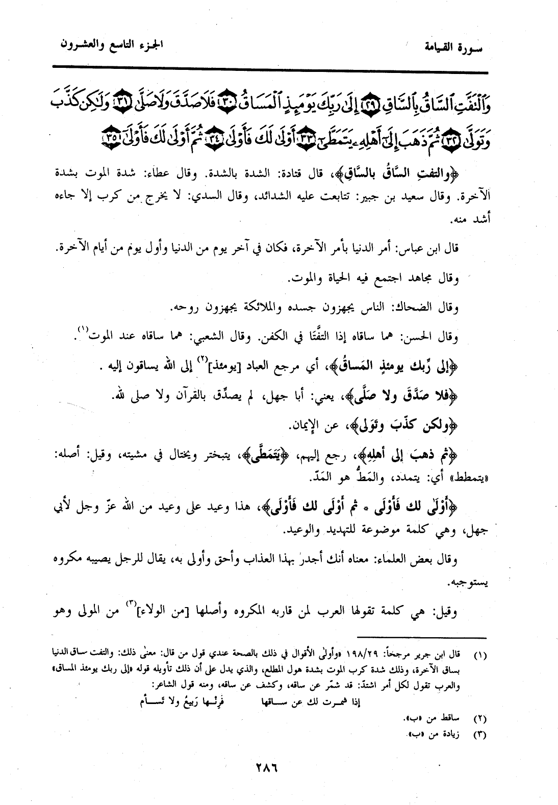 (1) قال ابن جرير مرجحا: 29 / 198 "وأولى الأقوال في ذلك بالصحة عندي قول من قال: معنى ذلك: والتفت ساق الدنيا بساق الآخرة، وذلك شدة كرب الموت بشدة هول المطلع، والذي يدل على أن ذلك تأويله قوله "إلى ربك يومئذ المساق" والعرب تقول لكل أمر اشتد: قد شمر عن ساقه، وكشف عن ساقه، ومنه قول الشاعر: إذا شمرت لك عن ساقها ... فرنها ربيع ولا تسأم.