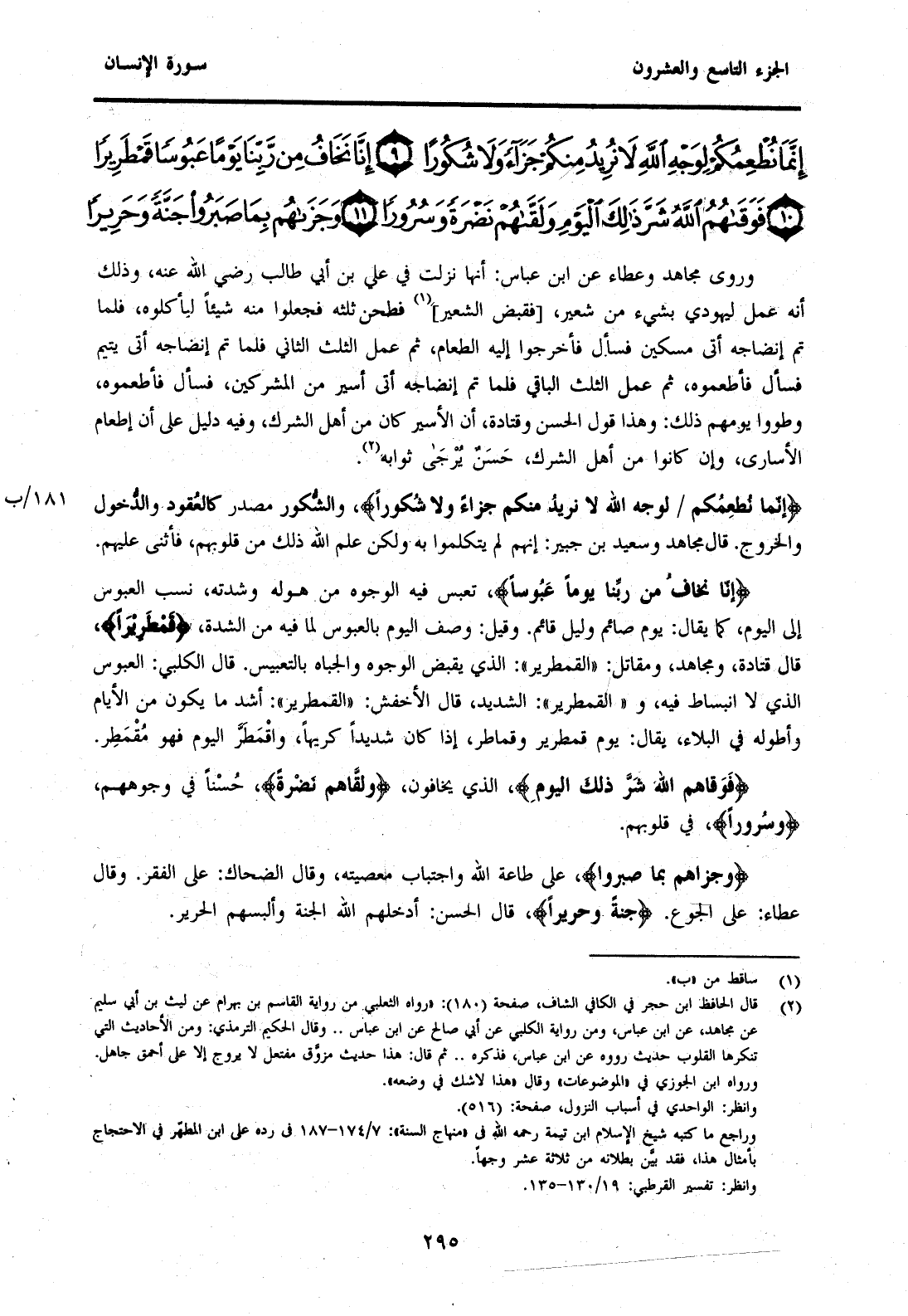 (2) قال الحافظ ابن حجر في الكافي الشاف، صفحة (180) : "رواه الثعلبي من رواية القاسم بن بهرام عن ليث بن أبي سليم عن مجاهد، عن ابن عباس، ومن رواية الكلبي عن أبي صالح عن ابن عباس.. وقال الحكيم الترمذي: ومن الأحاديث التي تنكرها القلوب حديث رووه عن ابن عباس، فذكره.. ثم قال: هذا حديث مزوَّق مفتعل لا يروج إلا على أحمق جاهل. ورواه ابن الجوزي في "الموضوعات" وقال "هذا لا شك في وضعه". وانظر: الواحدي في أسباب النزول، صفحة: (516) . وراجع ما كتبه شيخ الإسلام ابن تيمية رحمه الله في "منهاج السنة": 7 / 174-187 في رده على ابن المطهر في الاحتجاج بأمثال هذا، فقد بين بطلانه من ثلاثة عشر وجها. وانظر: تفسير القرطبي: 19 / 130-135.