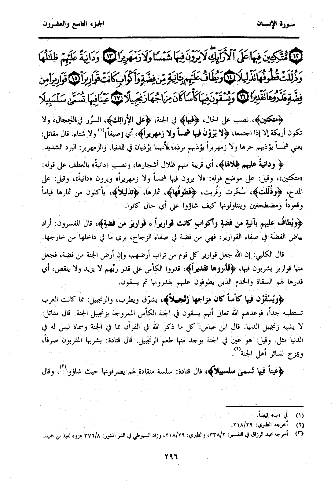 {مُتَّكِئِينَ فِيهَا عَلَى الْأَرَائِكِ لَا يَرَوْنَ فِيهَا شَمْسًا وَلَا زَمْهَرِيرًا (13) وَدَانِيَةً عَلَيْهِمْ ظِلَالُهَا وَذُلِّلَتْ قُطُوفُهَا تَذْلِيلًا (14) وَيُطَافُ عَلَيْهِمْ بِآنِيَةٍ مِنْ فِضَّةٍ وَأَكْوَابٍ كَانَتْ قَوَارِيرَ (15) قَوَارِيرَ مِنْ فِضَّةٍ قَدَّرُوهَا تَقْدِيرًا (16) وَيُسْقَوْنَ فِيهَا كَأْسًا كَانَ مِزَاجُهَا زَنْجَبِيلًا (17) عَيْنًا فِيهَا تُسَمَّى سَلْسَبِيلًا (18) }