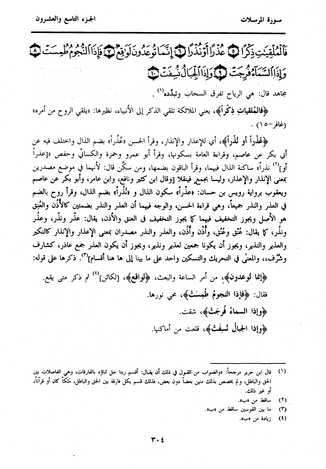 {فَالْمُلْقِيَاتِ ذِكْرًا} يَعْنِي الْمَلَائِكَةَ تُلْقِي الذِّكْرَ إِلَى الْأَنْبِيَاءِ، نَظِيرُهَا: "يُلْقِي الرُّوحَ مِنْ أَمْرِهِ" (غَافِرٍ-15) . {عُذْرًا أَوْ نُذْرًا} أَيْ لِلْإِعْذَارِ وَالْإِنْذَارِ، وَقَرَأَ الْحَسَنُ "عُذُرًا" بِضَمِّ الذَّالِ وَاخْتُلِفَ فِيهِ عَنْ أَبِي بَكْرٍ عَنْ عَاصِمٍ، وَقِرَاءَةُ الْعَامَّةِ بِسُكُونِهَا، وَقَرَأَ أَبُو عَمْرٍو وَحَمْزَةُ وَالْكِسَائِيُّ وَحَفْصٌ " [عُذْرًا أَوْ] (2) نُذْرًا" سَاكِنَةُ الذَّالِ فِيهِمَا، وَقَرَأَ الْبَاقُونَ بِضَمِّهَا، وَمَنْ سَكَّنَ قَالَ: لِأَنَّهُمَا فِي مَوْضِعِ مَصْدَرَيْنِ بِمَعْنَى الْإِنْذَارِ وَالْإِعْذَارِ، وَلَيْسَا بِجَمْعٍ فَيُنْقَلَا [وَقَالَ ابْنُ كَثِيرٍ وَنَافِعٌ، وَابْنُ عَامِرٍ، وَأَبُو بَكْرٍ عَنْ عَاصِمٍ وَيَعْقُوبُ بِرِوَايَةِ رُوَيْسِ بْنِ حَسَّانَ: "عُذْرًا" سُكُونُ الذَّالِ وَ"نُذُرًا" بِضَمِّ الذَّالِ، وَقَرَأَ رَوْحٌ بِالضَّمِّ فِي الْعُذُرِ وَالنُّذُرِ جَمِيعًا، وَهِيَ قِرَاءَةُ الْحَسَنِ، وَالْوَجْهُ فِيهِمَا أَنَّ الْعُذُرَ وَالنُّذُرَ بِضَمَّتَيْنِ كَالْأُذُنِ وَالعُنُقِ هُوَ الْأَصْلُ وَيَجُوزُ التَّخْفِيفُ فِيهِمَا كَمَا يَجُوزُ التَّخْفِيفُ فِي الْعُنُقِ وَالْأُذُنِ، يُقَالُ: عُذْرٌ وَنُذْرٌ، وَعُذُرٌ وَنُذُرٌ، كَمَا يُقَالُ: عُنْقٌ وَعُنُقٌ، وَأُذْنٌ وَأُذُنٌ، وَالْعُذْرُ وَالنُّذْرُ مَصْدَرَانِ بِمَعْنَى الْإِعْذَارِ وَالْإِنْذَارِ كَالنَّكِيرِ وَالْعَذِيرِ وَالنَّذِيرِ، وَيَجُوزُ أَنْ يَكُونَا جَمْعَيْنِ لِعَذِيرٍ وَنَذِيرٍ، وَيَجُوزُ أَنْ يَكُونَ الْعُذُرُ جَمْعُ عَاذِرٍ، كَشَارِفٍ وشُرُفٍ، وَالْمَعْنَى فِي التَّحْرِيكِ وَالتَّسْكِينِ وَاحِدٌ عَلَى مَا بَيَّنَّا إِلَى هَاهُنَا أَقْسَامٌ] (3) ذَكَرَهَا عَلَى قَوْلِهِ: {إِنَّ مَا تُوعَدُونَ} {إِنَّ مَا تُوعَدُونَ} مِنْ أَمْرِ السَّاعَةِ وَالْبَعْثِ {لَوَاقِعٌ} [لَكَائِنٌ] (4) ثُمَّ ذَكَرَ مَتَى يَقَعُ. فَقَالَ: {فَإِذَا النُّجُومُ طُمِسَتْ} مُحِيَ نُورُهَا. {وَإِذَا السَّمَاءُ فُرِجَتْ} شُقَّتْ. {وَإِذَا الْجِبَالُ نُسِفَتْ} قُلِعَتْ مِنْ أَمَاكِنِهَا.