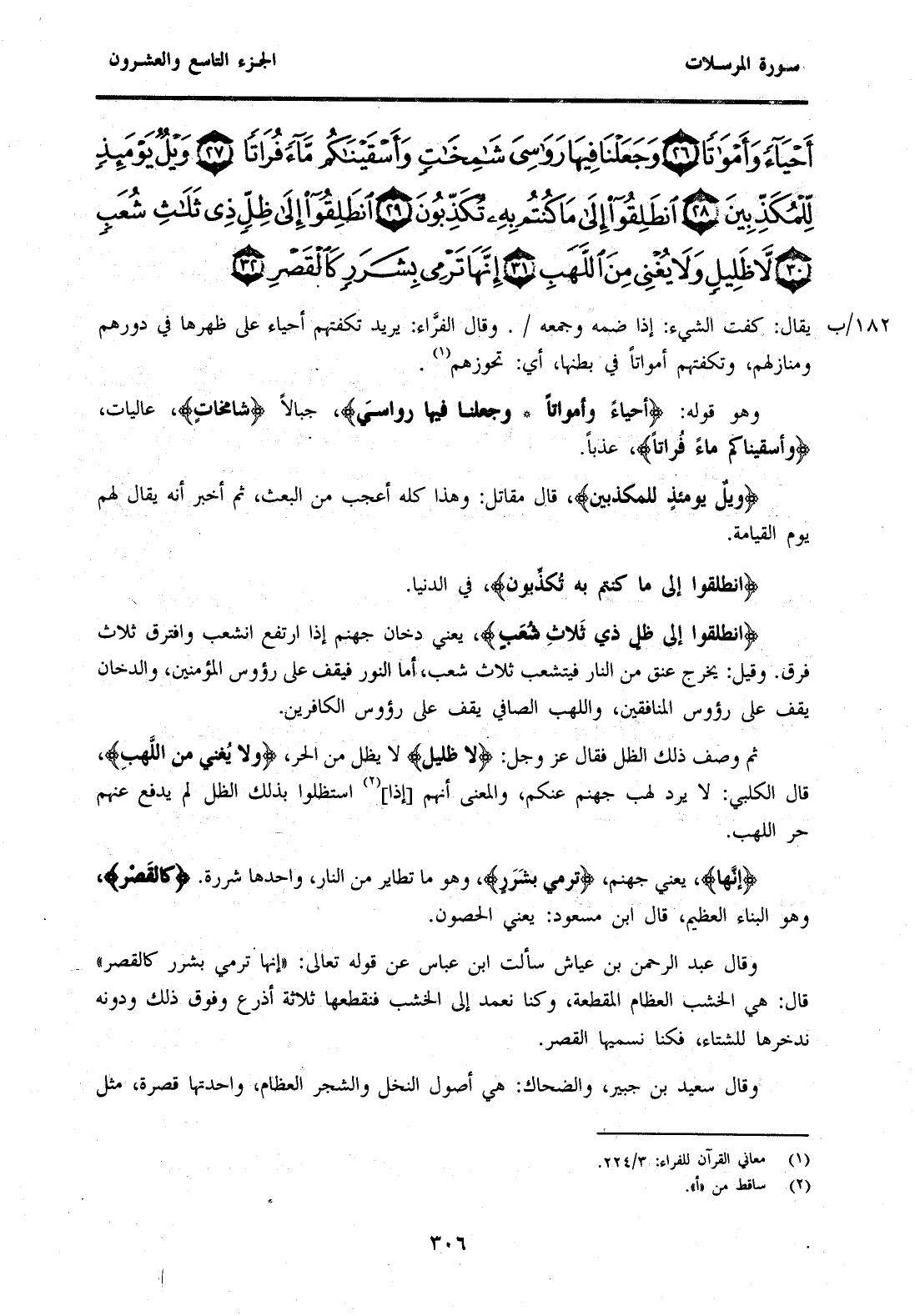 {أَحْيَاءً وَأَمْوَاتًا (26) وَجَعَلْنَا فِيهَا رَوَاسِيَ شَامِخَاتٍ وَأَسْقَيْنَاكُمْ مَاءً فُرَاتًا (27) وَيْلٌ يَوْمَئِذٍ لِلْمُكَذِّبِينَ (28) انْطَلِقُوا إِلَى مَا كُنْتُمْ بِهِ تُكَذِّبُونَ (29) انْطَلِقُوا إِلَى ظِلٍّ ذِي ثَلَاثِ شُعَبٍ (30) لَا ظَلِيلٍ وَلَا يُغْنِي مِنَ اللَّهَبِ (31) إِنَّهَا تَرْمِي بِشَرَرٍ كَالْقَصْرِ (32) }
