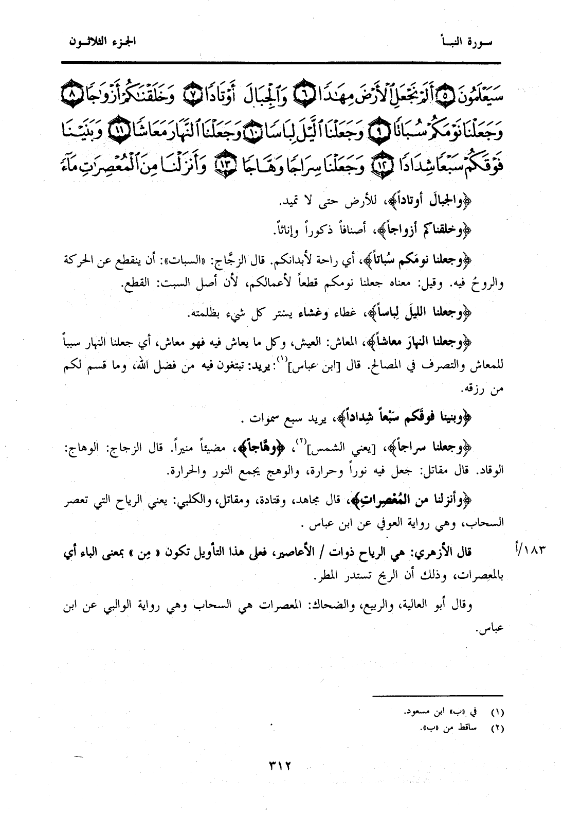 {وَالْجِبَالَ أَوْتَادًا} لِلْأَرْضِ حَتَّى لَا تَمِيدَ. {وَخَلَقْنَاكُمْ أَزْوَاجًا} أَصْنَافًا ذُكُورًا وَإِنَاثًا. {وَجَعَلْنَا نَوْمَكُمْ سُبَاتًا} أَيْ رَاحَةً لِأَبْدَانِكُمْ. قَالَ الزَّجَّاجُ: "السُّبَاتُ" أَنْ يَنْقَطِعَ عَنِ الْحَرَكَةِ وَالرُّوحُ فِيهِ. وَقِيلَ: مَعْنَاهُ جَعَلْنَا نَوْمَكُمْ قَطْعًا لِأَعْمَالِكُمْ، لِأَنَّ أَصْلَ السَّبْتِ: الْقَطْعُ. {وَجَعَلْنَا اللَّيْلَ لِبَاسًا} غِطَاءً وَغِشَاءً يَسْتُرُ كُلَّ شَيْءٍ بِظُلْمَتِهِ. {وَجَعَلْنَا النَّهَارَ مَعَاشًا} الْمَعَاشُ: الْعَيْشُ، وَكُلُّ مَا يُعَاشُ فِيهِ فَهُوَ مَعَاشٌ، أَيْ جَعَلْنَا النَّهَارَ سَبَبًا لِلْمَعَاشِ وَالتَّصَرُّفِ فِي الْمَصَالِحِ. قَالَ [ابْنُ عَبَّاسٍ] (1) يُرِيدُ: تَبْتَغُونَ فِيهِ مِنْ فَضْلِ اللَّهِ، وَمَا قَسَّمَ لَكُمْ مِنْ رِزْقِهِ. {وَبَنَيْنَا فَوْقَكُمْ سَبْعًا شِدَادًا} يُرِيدُ سَبْعَ سَمَاوَاتٍ. {وَجَعَلْنَا سِرَاجًا} [يَعْنِي الشَّمْسَ] (2) {وَهَّاجًا} مُضِيئًا مُنِيرًا. قَالَ الزَّجَّاجُ: الْوَهَّاجُ: الْوَقَّادُ. قَالَ مُقَاتِلٌ: جَعَلَ فِيهِ نُورًا وَحَرَارَةً، وَالْوَهَجُ يَجْمَعُ النُّورَ وَالْحَرَارَةَ. {وَأَنْزَلْنَا مِنَ الْمُعْصِرَاتِ} قَالَ مُجَاهِدٌ، وَقَتَادَةُ، وَمُقَاتِلٌ، وَالْكَلْبِيُّ: يَعْنِي الرِّيَاحَ الَّتِي تَعْصِرُ السَّحَابَ، وَهِيَ رِوَايَةُ الْعَوْفِيُّ عَنِ ابْنِ عَبَّاسٍ.