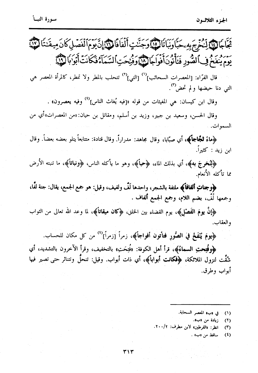 {لِنُخْرِجَ بِهِ} أَيْ بِذَلِكَ الْمَاءِ {حَبًّا} وَهُوَ مَا يَأْكُلُهُ النَّاسُ {وَنَبَاتًا} مَا تُنْبِتُهُ الْأَرْضُ مِمَّا تَأْكُلُهُ الْأَنْعَامُ. {وَجَنَّاتٍ أَلْفَافًا} مُلْتَفَّةً بِالشَّجَرِ، واحدها لَفٌ وليف، وَقِيلَ: هُوَ جَمْعُ الْجَمْعِ، يُقَالُ: جَنَّةٌ لَفًّا، وَجَمْعُهَا لُفٌ، بِضَمِّ اللَّامِ، وَجَمْعُ الْجَمْعِ أَلْفَافٌ. {إِنَّ يَوْمَ الْفَصْلِ} يَوْمَ الْقَضَاءِ بَيْنَ الْخَلْقِ {كَانَ مِيقَاتًا} لِمَا وَعَدَ اللَّهُ مِنَ الثَّوَابِ وَالْعِقَابِ. {يَوْمَ يُنْفَخُ فِي الصُّورِ فَتَأْتُونَ أَفْوَاجًا} زُمَرًا [زُمَرًا] (4) مِنْ كُلِّ مَكَانٍ لِلْحِسَابِ. {وَفُتِحَتِ السَّمَاءُ} قَرَأَ أَهْلُ الْكُوفَةِ: "فُتِحَتْ" بِالتَّخْفِيفِ، وَقَرَأَ الْآخَرُونَ بِالتَّشْدِيدِ، أَيْ شُقَّتْ لِنُزُولِ الْمَلَائِكَةِ {فَكَانَتْ أَبْوَابًا} أَيْ ذَاتَ أَبْوَابٍ. وَقِيلَ: تَنْحَلُّ، وَتَتَنَاثَرُ حَتَّى تَصِيرَ فِيهَا أَبْوَابٌ وَطُرُقٌ.