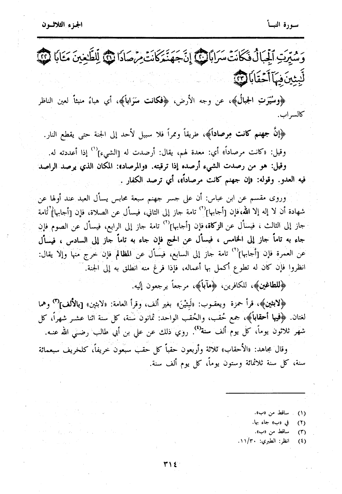 وَرَوَى مُقْسِمٌ عَنِ ابْنِ عَبَّاسٍ: أَنَّ عَلَى جسر جهنم سبع مَحَابِسَ يُسْأَلُ الْعَبْدُ عِنْدَ أَوَّلِهَا عَنْ شَهَادَةِ أَنْ لَا إِلَهَ إِلَّا اللَّهُ، فَإِنْ [أَجَابَهَا] (2) تَامَّةً جَازَ إِلَى الثَّانِي، فَيُسْأَلُ عَنِ الصَّلَاةِ، فَإِنْ [أَجَابَهَا] (3) تَامَّةً جَازَ إِلَى الثَّالِثِ، فَيُسْأَلُ عَنِ الزَّكَاةِ، فَإِنْ [أَجَابَهَا] (4) تَامَّةً جَازَ إِلَى الرَّابِعِ، فَيُسْأَلُ عَنِ الصَّوْمِ فَإِنْ جَاءَ بِهِ تَامًّا جَازَ إِلَى الْخَامِسِ، فَيُسْأَلُ عَنِ الْحَجِّ فَإِنْ جَاءَ بِهِ تَامًّا جَازَ إِلَى السَّادِسِ، فَيُسْأَلُ عَنِ الْعُمْرَةِ فَإِنْ [أَجَابَهَا] (5) تَامَّةً جَازَ إِلَى السَّابِعِ، فَيُسْأَلُ عَنِ الْمَظَالِمِ فَإِنْ خَرَجَ مِنْهَا وَإِلَّا يُقَالُ: انْظُرُوا فَإِنْ كَانَ لَهُ تَطَوُّعٌ أُكْمِلَ بِهِ أَعْمَالُهُ، فَإِذَا فُرِغَ مِنْهُ انْطُلِقَ بِهِ إِلَى الْجَنَّةِ. {َّ لِلطَّاغِينَ} لِلْكَافِرِينَ {مَآبًا} مَرْجِعًا يَرْجِعُونَ إِلَيْهِ. {لَابِثِينَ} قَرَأَ حَمْزَةُ وَيَعْقُوبُ: "لَبِثِينَ" بِغَيْرِ أَلِفٍ، وَقَرَأَ الْعَامَّةُ "لَابِثِينَ" [بِالْأَلِفِ] (6) وَهُمَا لُغَتَانِ. {فِيهَا أَحْقَابًا} جَمْعُ حِقْبٍ، وَالْحِقْبُ الْوَاحِدُ: ثَمَانُونَ سَنَةً، كُلُّ سَنَةٍ اثْنَا عَشَرَ شَهْرًا، كُلُّ شَهْرٍ ثَلَاثُونَ يَوْمًا، كُلُّ يَوْمٍ أَلْفُ سَنَةٍ (7) . رُوِيَ ذَلِكَ عَنْ عَلِيِّ بْنِ أَبِي طَالِبٍ رَضِيَ اللَّهُ عَنْهُ.