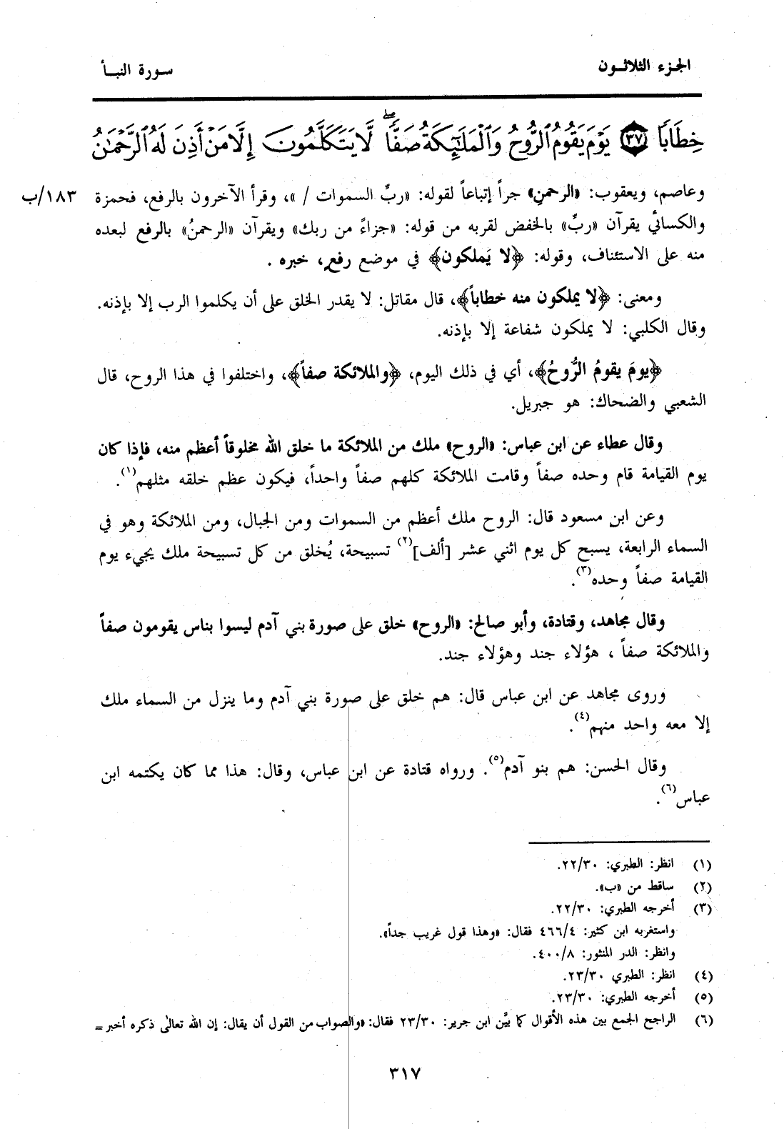 (6) الراجح الجمع بين هذه الأقوال كما بين ابن جرير: 30 / 23 فقال: "والصواب من القول أن يقال: إن الله تعالى ذكره أخبر أن خلقه لا يملكون منه خطابا، يوم يقوم الروح، والروح خلق من خلقه، وجائز أن يكون بعض هذه الأشياء التي ذكرت، والله أعلم أي ذلك هو، ولا خبر بشيء من ذلك أنه المعني به دون غيره يجب التسليم له، ولا حجة تدل عليه، وغير ضائر الجهل به". وراجع ابن كثير: 4 / 466 -467 فقد رجح أنهم بنو آدم.