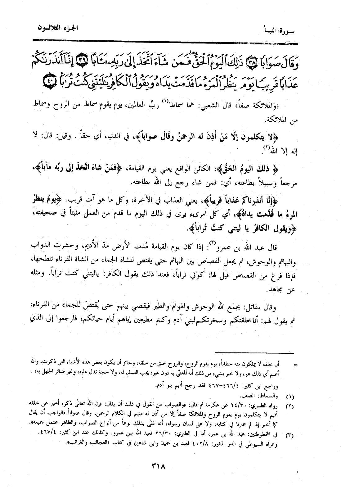 (2) رواه الطبري: 30 / 24 عن عكرمة ثم قال: "والصواب من القول في ذلك أن يقال: "إن الله تعالى ذكره أخبر عن خلقه أنهم لا يتكلمون يوم يقوم الروح والملائكة صفا إلا من أذن له منهم في الكلام الرحمن، وقال صوابا فالواجب أن يقال كما أخبر إذ لم يخبرنا في كتابه، ولا على لسان رسوله، أنه عنى بذلك نوعا من أنواع الصواب، والظاهر محتمل جميعه".