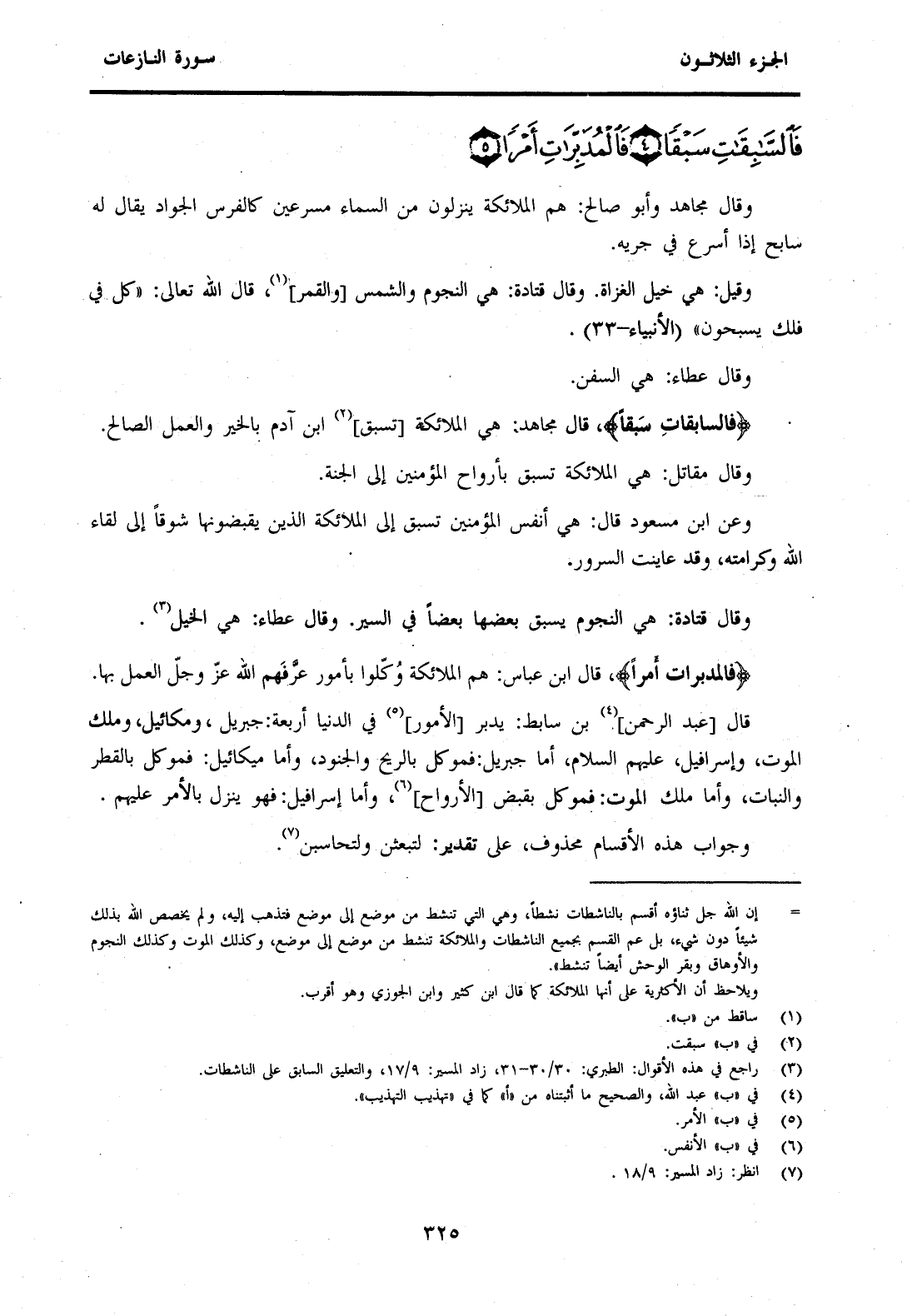 وَقَالَ قَتَادَةُ: هِيَ النُّجُومُ يَسْبِقُ بَعْضُهَا بَعْضًا فِي السَّيْرِ. وَقَالَ عَطَاءٌ: هِيَ الْخَيْلُ (3) . {فَالْمُدَبِّرَاتِ أَمْرًا} قَالَ ابْنُ عَبَّاسٍ: هُمُ الْمَلَائِكَةُ وُكِّلُوا بِأُمُورٍ عَرَّفَهُمُ اللَّهُ عَزَّ وَجَلَّ الْعَمَلَ بِهَا.