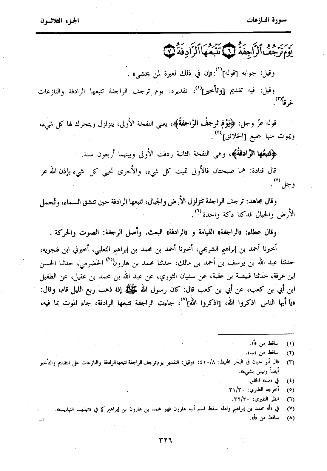 (3) قال أبو حيان في البحر المحيط: 8 / 420: "وقيل التقدير يوم ترجف الراجفة تتبعها الرادفة والنازعات على التقديم والتأخير أيضا وليس بشيء".