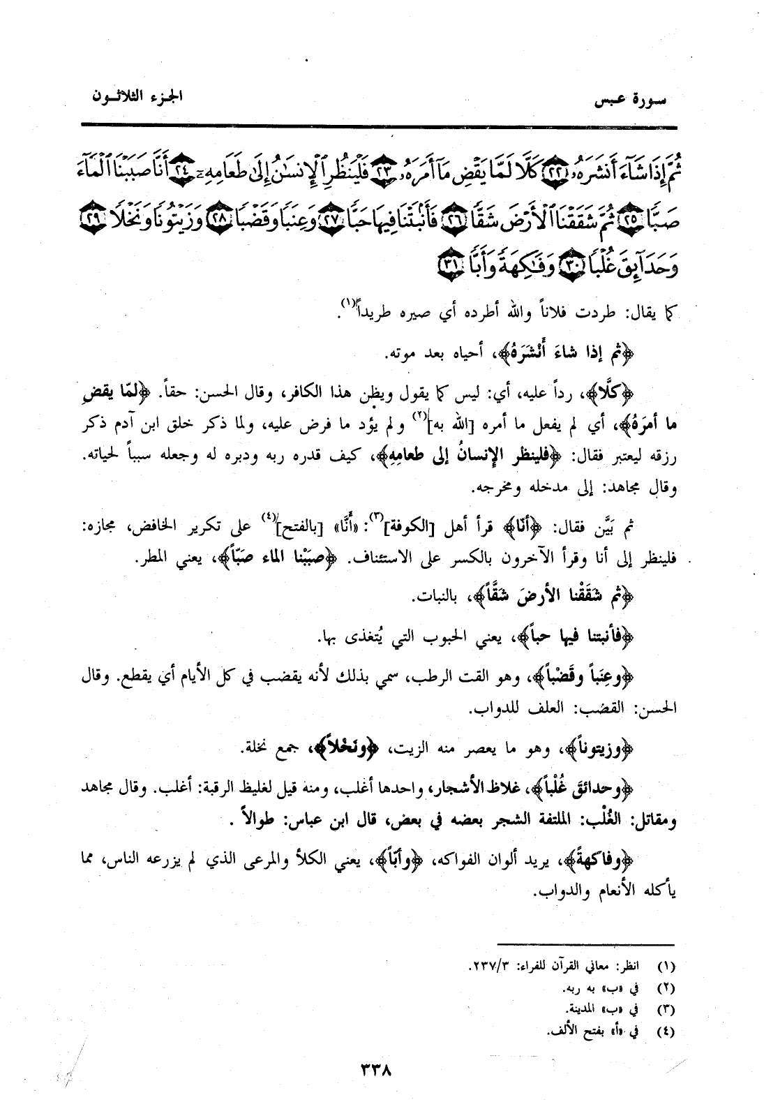{ثُمَّ إِذَا شَاءَ أَنْشَرَهُ} أَحْيَاهُ بَعْدَ مَوْتِهِ. {كَلَّا} رَدًّا عَلَيْهِ، أَيْ: لَيْسَ كَمَا يَقُولُ وَيَظُنُّ هَذَا الْكَافِرُ، وَقَالَ الْحَسَنُ: حَقًا. {لَمَّا يَقْضِ مَا أَمَرَهُ} أَيْ لَمْ يَفْعَلْ مَا أَمَرَهُ [اللَّهُ بِهِ] (2) وَلَمْ يُؤَدِّ مَا فُرِضَ عَلَيْهِ، وَلَمَّا ذَكَرَ خَلْقَ ابْنِ آدَمَ ذَكَرَ رِزْقَهُ لِيَعْتَبِرَ فَقَالَ: {فَلْيَنْظُرِ الْإِنْسَانُ إِلَى طَعَامِهِ} {فَلْيَنْظُرِ الإنْسَانُ إِلَى طَعَامِهِ} كَيْفَ قَدَّرَهُ رَبُّهُ وَدَبَّرَهُ لَهُ وَجَعَلَهُ سَبَبًا لِحَيَاتِهِ. وَقَالَ مُجَاهِدٌ: إِلَى مَدْخَلِهِ وَمَخْرَجِهِ. ثُمَّ بَيَّنَ فَقَالَ: {أَنَّا} قَرَأَ أَهْلُ [الْكُوفَةِ] (3) "أَنَّا" [بِالْفَتْحِ] (4) عَلَى تَكْرِيرِ الْخَافِضِ، مَجَازُهُ: فَلْيَنْظُرْ إِلَى أَنَّا وَقَرَأَ الْآخَرُونَ بِالْكَسْرِ عَلَى الِاسْتِئْنَافِ. {صَبَبْنَا الْمَاءَ صَبًّا} يَعْنِي الْمَطَرَ. {ثُمَّ شَقَقْنَا الْأَرْضَ شَقًّا} بِالنَّبَاتِ. {فَأَنْبَتْنَا فِيهَا حَبًّا} يَعْنِي الْحُبُوبَ الَّتِي يُتَغَذَّى بِهَا. {وَعِنَبًا وَقَضْبًا} وَهُوَ الْقَتُّ الرَّطْبُ، سُمِّيَ بِذَلِكَ لِأَنَّهُ يُقْضَبُ فِي كُلِّ الْأَيَّامِ أَيْ يُقْطَعُ. وَقَالَ الْحَسَنُ: الْقَضْبُ: الْعَلَفُ لِلدَّوَابِّ. {وَزَيْتُونًا} وَهُوَ مَا يُعْصَرُ مِنْهُ الزَّيْتُ {وَنَخْلًا} جَمْعُ نَخْلَةٍ. {وَحَدَائِقَ غُلْبًا} غِلَاظُ الْأَشْجَارِ، وَاحِدُهَا أَغْلَبُ، ومنه قيل الغليظ الرَّقَبَةِ: أَغْلَبُ. وَقَالَ مُجَاهِدٌ وَمُقَاتِلٌ: الْغُلْبُ: الْمُلْتَفَّةُ الشَّجَرِ بَعْضِهِ فِي بَعْضٍ، قَالَ ابْنُ عَبَّاسٍ: طِوَالًا. {وَفَاكِهَةً} يُرِيدُ أَلْوَانَ الْفَوَاكِهِ {وَأَبًّا} يَعْنِي الْكَلَأَ وَالْمَرْعَى الَّذِي لَمْ يَزْرَعْهُ النَّاسُ، مِمَّا يَأْكُلُهُ الْأَنْعَامُ وَالدَّوَابُّ.