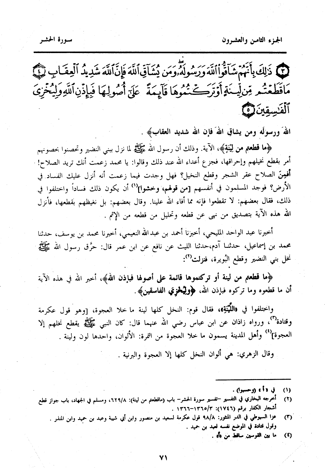 (2) أخرجه البخاري في التفسير - تفسير سورة الحشر - باب (ما قطعتم من لينة) : 8 / 629، ومسلم في الجهاد، باب جواز قطع أشجار الكفار برقم (1746) : 3 / 1365 - 1366.