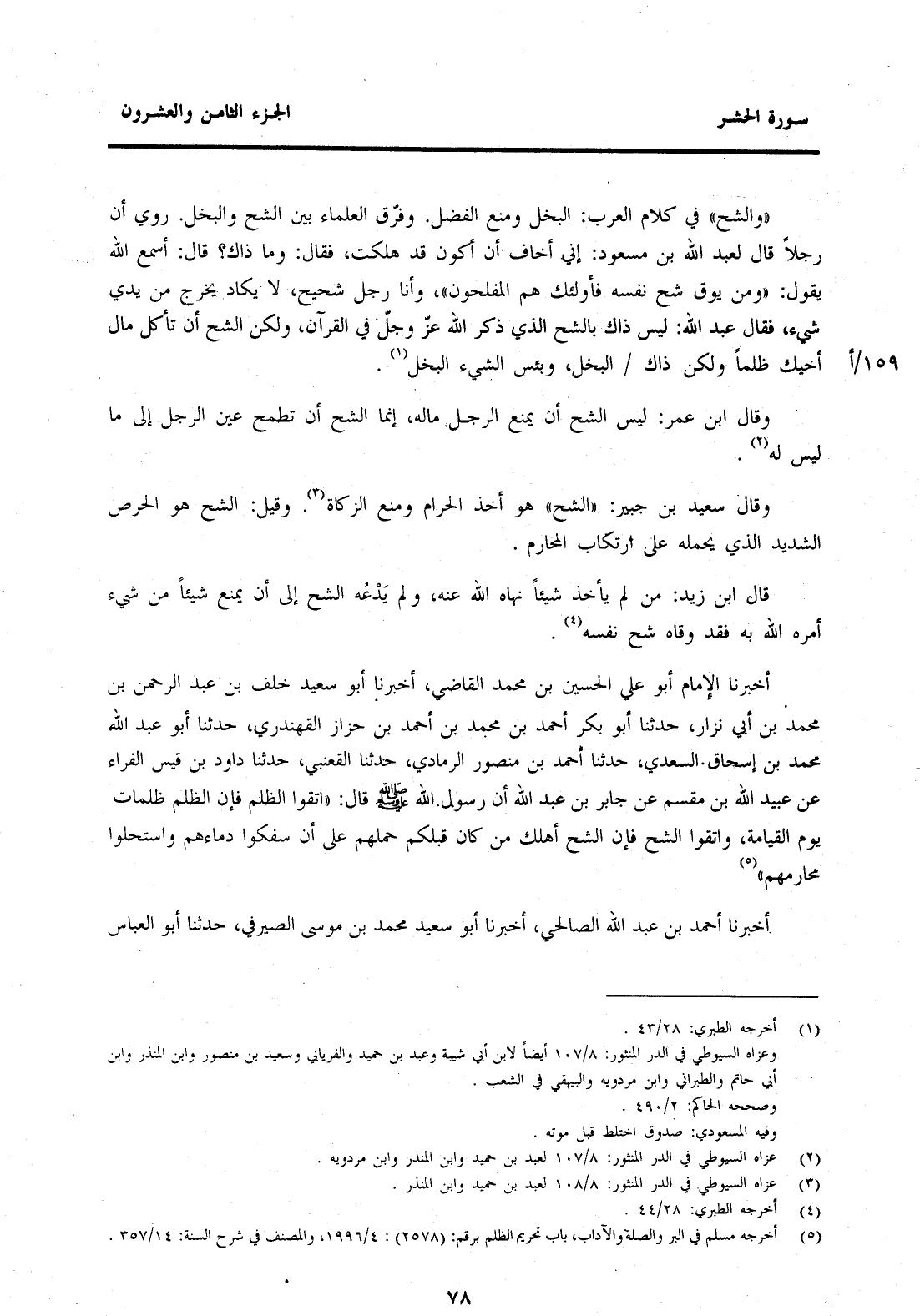 (1) أخرجه الطبري: 28 / 43. وعزاه السيوطي في الدر المنثور: 8 / 107 أيضا لابن أبي شيبة وعبد بن حميد والفريابي وسعيد بن منصور وابن المنذر وابن أبي حاتم والطبراني وابن مردويه والبيهقي في الشعب. وصححه الحاكم: 2 / 490. وفيه المسعودي: صدوق اختلط قبل موته.