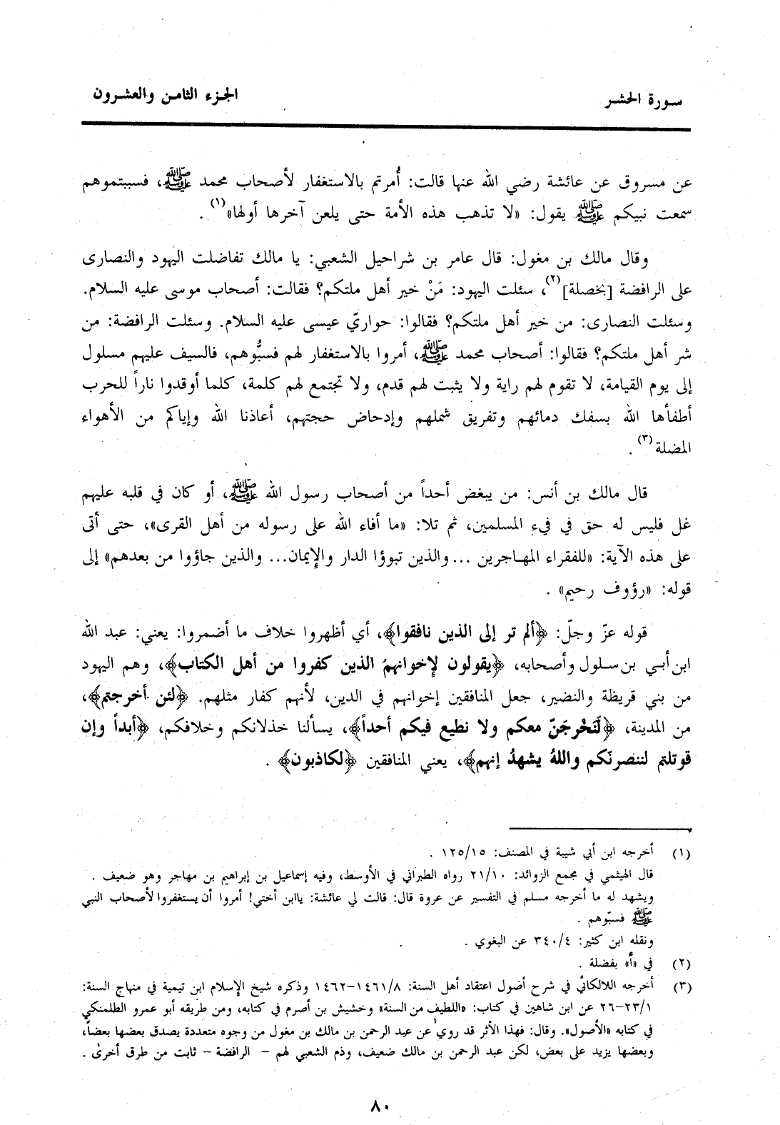 قَالَ مَالِكُ بْنُ أَنَسٍ: مَنْ يُبْغِضُ أَحَدًا مِنْ أَصْحَابِ رَسُولِ اللَّهِ صَلَّى اللَّهُ عَلَيْهِ وَسَلَّمَ أَوْ كَانَ فِي قَلْبِهِ عَلَيْهِمْ غِلٌّ فَلَيْسَ لَهُ حَقٌّ فِي فَيْءِ الْمُسْلِمِينَ ثُمَّ تَلَا "مَا أَفَاءَ اللَّهُ عَلَى رَسُولِهِ مِنْ أَهْلِ الْقُرَى" حَتَّى أَتَى عَلَى هَذِهِ الْآيَةِ: "لِلْفُقَرَاءِ الْمُهَاجِرِينَ ... وَالَّذِينَ تَبَوَّءُوا الدَّارَ وَالْإِيمَانَ ... وَالَّذِينَ جَاءُوا مِنْ بَعْدِهِمْ" إِلَى قَوْلِهِ: رَءُوفٌ رَحِيمٌ". قَوْلُهُ عَزَّ وَجَلَّ: {أَلَمْ تَرَ إِلَى الَّذِينَ نَافَقُوا} أَيْ أَظْهَرُوا خِلَافَ مَا أَضْمَرُوا: يَعْنِي: عَبْدَ اللَّهِ بْنَ أُبَيٍّ ابْنَ سَلُولَ وَأَصْحَابَهُ {يَقُولُونَ لِإِخْوَانِهِمُ الَّذِينَ كَفَرُوا مِنْ أَهْلِ الْكِتَابِ} الْيَهُودِ مِنْ بَنِي قُرَيْظَةَ وَالنَّضِيرِ، جَعْلَ الْمُنَافِقِينَ إِخْوَانَهُمْ فِي الدِّينِ لِأَنَّهُمْ كُفَّارٌ مِثْلَهُمْ. {لَئِنْ أُخْرِجْتُمْ} الْمَدِينَةِ {لَنَخْرُجَنَّ مَعَكُمْ وَلَا نُطِيعُ فِيكُمْ أَحَدًا} يَسْأَلُنَا خِذْلَانَكُمْ وَخِلَافَكُمْ {أَبَدًا وَإِنْ قُوتِلْتُمْ لَنَنْصُرَنَّكُمْ وَاللَّهُ يَشْهَدُ إِنَّهُمْ} يَعْنِي الْمُنَافِقِينَ {لَكَاذِبُونَ}