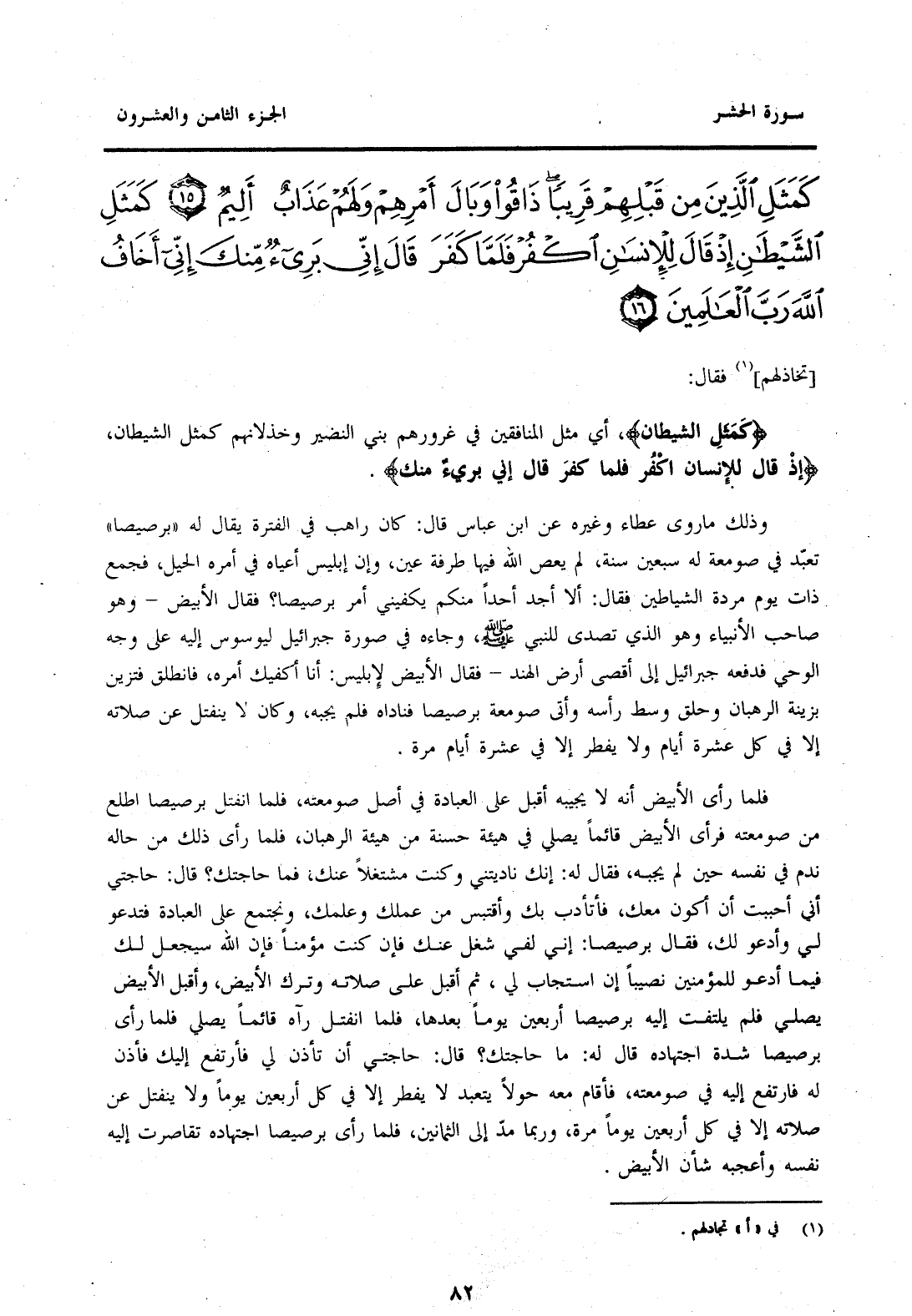 [تَخَاذُلِهِمْ] (1) فَقَالَ: {كَمَثَلِ الشَّيْطَانِ} أَيْ مَثَلُ الْمُنَافِقِينَ فِي غُرُورِهِمْ بَنِي النَّضِيرِ وَخِذْلَانِهِمْ كَمَثَلِ الشَّيْطَانِ {إِذْ قَالَ لِلْإِنْسَانِ اكْفُرْ فَلَمَّا كَفَرَ قَالَ إِنِّي بَرِيءٌ مِنْكَ}