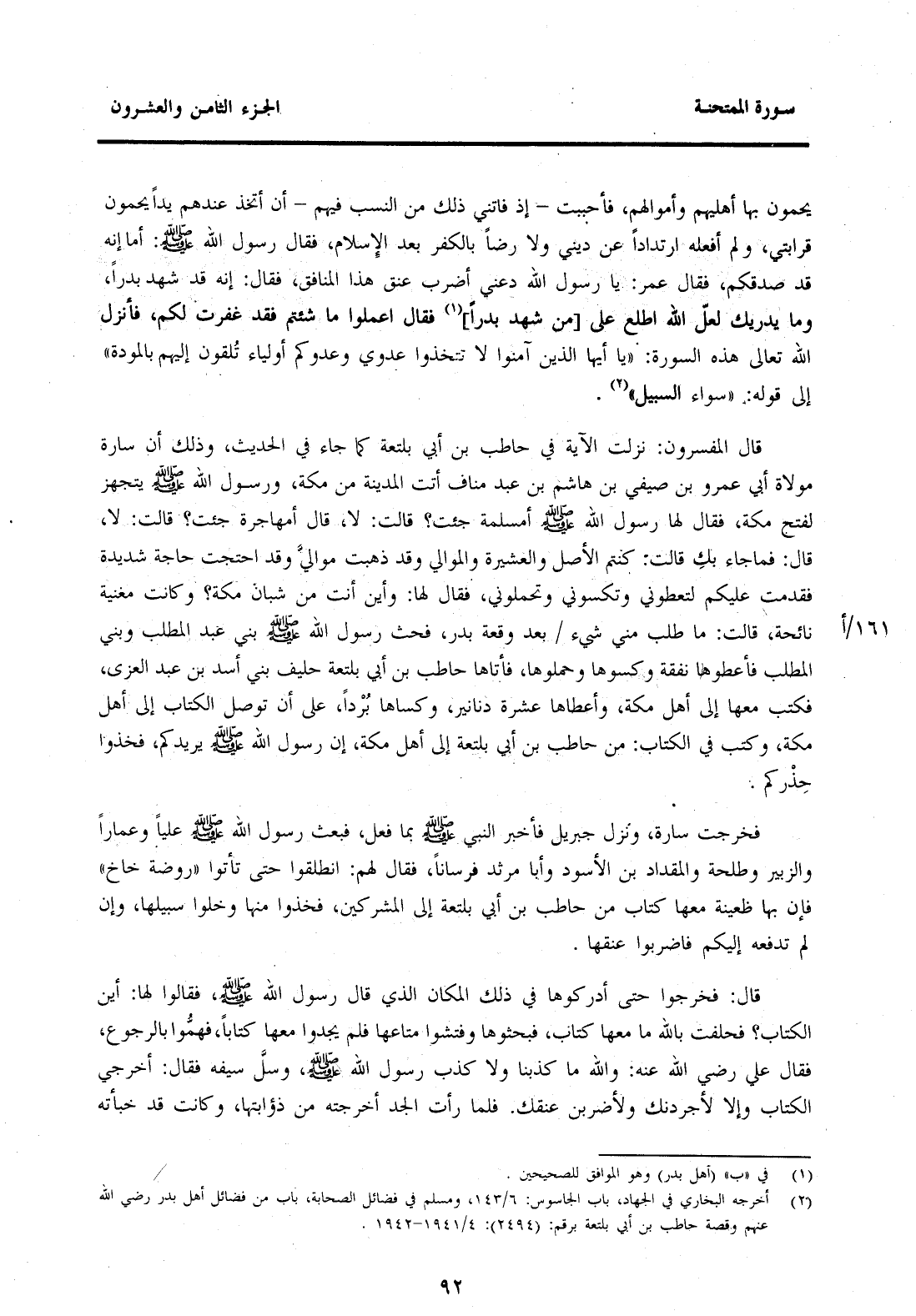 قَالَ الْمُفَسِّرُونَ: نَزَلَتِ الْآيَةُ فِي حَاطِبِ بْنِ أَبِي بَلْتَعَةَ كَمَا جَاءَ فِي الْحَدِيثِ، وَذَلِكَ أَنَّ سَارَةَ مَوْلَاةَ أَبِي عَمْرِو بْنِ صَيْفِيِّ بْنِ هَاشِمِ بْنِ عَبْدِ مَنَافٍ أَتَتِ الْمَدِينَةَ مِنْ مَكَّةَ، وَرَسُولُ اللَّهِ صَلَّى اللَّهُ عَلَيْهِ وَسَلَّمَ يَتَجَهَّزُ لِفَتْحِ مَكَّةَ، فَقَالَ لَهَا رَسُولُ اللَّهِ صَلَّى اللَّهُ عَلَيْهِ وَسَلَّمَ أَمُسْلِمَةً جِئْتِ؟ قَالَتْ: لَا قَالَ أَمُهَاجِرَةً جِئْتِ؟ قَالَتْ: لَا قَالَ: فَمَا جَاءَ بِكِ قَالَتْ: كُنْتُمُ الْأَصْلَ وَالْعَشِيرَةَ وَالْمَوَالِيَ وَقَدْ ذَهَبَتْ مَوَالِيَّ وَقَدِ احْتَجْتُ حَاجَةً شَدِيدَةً فَقَدِمْتُ عَلَيْكُمْ لِتُعْطُونِي وَتَكْسُوَنِي وَتَحْمِلُونِي، فَقَالَ لَهَا: وَأَيْنَ أَنْتِ مِنْ شُبَّانِ مَكَّةَ؟ وَكَانَتْ مُغَنِّيَةً نَائِحَةً، قَالَتْ: مَا طُلِبَ مني شيء 161/أبَعْدَ وَقْعَةِ بَدْرٍ، فَحَثَّ رَسُولُ اللَّهِ صَلَّى اللَّهُ عَلَيْهِ وَسَلَّمَ بَنِي عَبْدِ الْمُطَّلِبِ وَبَنِي الْمُطَّلِبِ فَأَعْطَوْهَا نَفَقَةً وَكَسَوْهَا وَحَمَلُوهَا فَأَتَاهَا حَاطِبُ بْنُ أَبِي بَلْتَعَةَ حَلِيفُ بَنِي أَسَدِ بْنِ عَبْدِ الْعُزَّى، فَكَتَبَ مَعَهَا إِلَى أَهْلِ مَكَّةَ، وَأَعْطَاهَا عَشْرَةَ دَنَانِيرَ، وَكَسَاهَا بُرْدًا عَلَى أَنْ تُوصِلَ الْكِتَابَ إِلَى أَهْلِ مَكَّةَ، وَكَتَبَ فِي الْكِتَابِ: مِنْ حَاطِبِ بْنِ أَبِي بَلْتَعَةَ إِلَى أَهْلِ مَكَّةَ، إِنَّ رَسُولَ اللَّهِ صَلَّى اللَّهُ عَلَيْهِ وَسَلَّمَ يُرِيدُكُمْ، فَخُذُوا حِذْرَكُمْ.