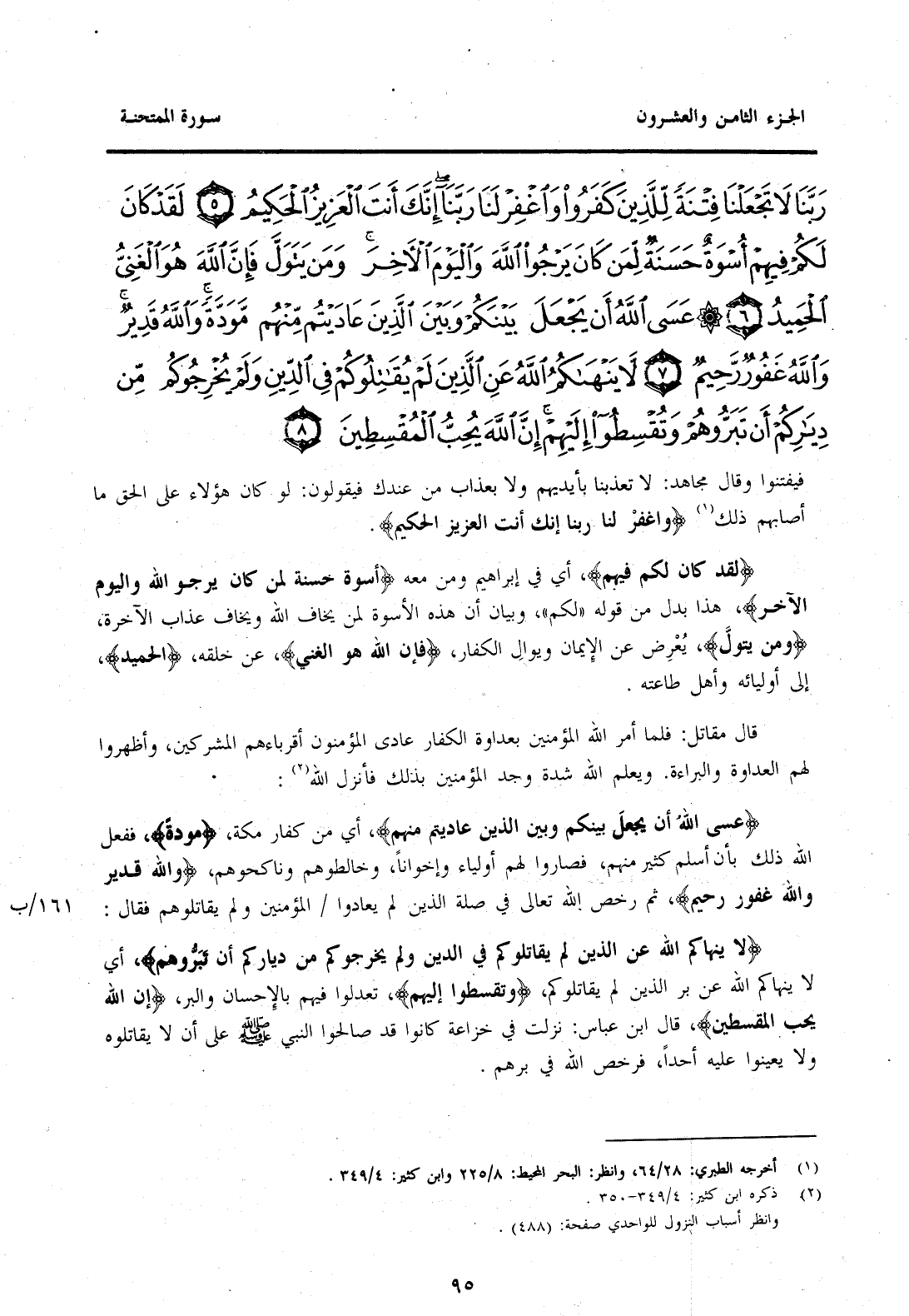 قَالَ مُقَاتِلٌ: فَلَمَّا أَمَرَ اللَّهُ الْمُؤْمِنِينَ بِعَدَاوَةِ الْكُفَّارِ عَادَى الْمُؤْمِنُونَ أَقْرِبَاءَهُمُ الْمُشْرِكِينَ وَأَظْهَرُوا لَهُمُ الْعَدَاوَةَ وَالْبَرَاءَةَ. وَيَعْلَمُ اللَّهُ شِدَّةَ وَجْدِ الْمُؤْمِنِينَ بِذَلِكَ فَأَنْزَلَ اللَّهُ (2) {عَسَى اللَّهُ أَنْ يَجْعَلَ بَيْنَكُمْ وَبَيْنَ الَّذِينَ عَادَيْتُمْ مِنْهُمْ} أَيْ مِنْ كُفَّارِ مَكَّةَ {مَوَدَّةً} فَفَعَلَ اللَّهُ ذَلِكَ بِأَنْ أَسْلَمَ كَثِيرٌ مِنْهُمْ، فَصَارُوا لَهُمْ أَوْلِيَاءَ وَإِخْوَانًا، وَخَالَطُوهُمْ وَنَاكَحُوهُمْ {وَاللَّهُ قَدِيرٌ وَاللَّهُ غَفُورٌ رَحِيمٌ} ثُمَّ رَخَّصَ اللَّهُ تَعَالَى فِي صِلَةِ الَّذِينَ لم يعادوا 161/ب الْمُؤْمِنِينَ وَلَمْ يُقَاتِلُوهُمْ فَقَالَ: {لَا يَنْهَاكُمُ اللَّهُ عَنِ الَّذِينَ لَمْ يُقَاتِلُوكُمْ فِي الدِّينِ وَلَمْ يُخْرِجُوكُمْ مِنْ دِيَارِكُمْ أَنْ تَبَرُّوهُمْ} {لَا يَنْهَاكُمُ اللَّهُ عَنِ الَّذِينَ لَمْ يُقَاتِلُوكُمْ فِي الدِّينِ وَلَمْ يُخْرِجُوكُمْ مِنْ دِيَارِكُمْ أَنْ تَبَرُّوهُمْ} أَيْ لَا يَنْهَاكُمُ اللَّهُ عَنْ بِرِّ الَّذِينَ لَمْ يُقَاتِلُوكُمْ {وَتُقْسِطُوا إِلَيْهِمْ} تَعْدِلُوا فِيهِمْ بِالْإِحْسَانِ وَالْبِرِّ {إِنَّ اللَّهَ يُحِبُّ الْمُقْسِطِينَ} قَالَ ابْنُ عَبَّاسٍ: نَزَلَتْ فِي خُزَاعَةَ كَانُوا قَدْ صَالَحُوا النَّبِيَّ صَلَّى اللَّهُ عَلَيْهِ وَسَلَّمَ عَلَى أَنْ لَا يُقَاتِلُوهُ وَلَا يُعِينُوا عَلَيْهِ أَحَدًا، فَرَخَّصَ اللَّهُ فِي بِرِّهِمْ.