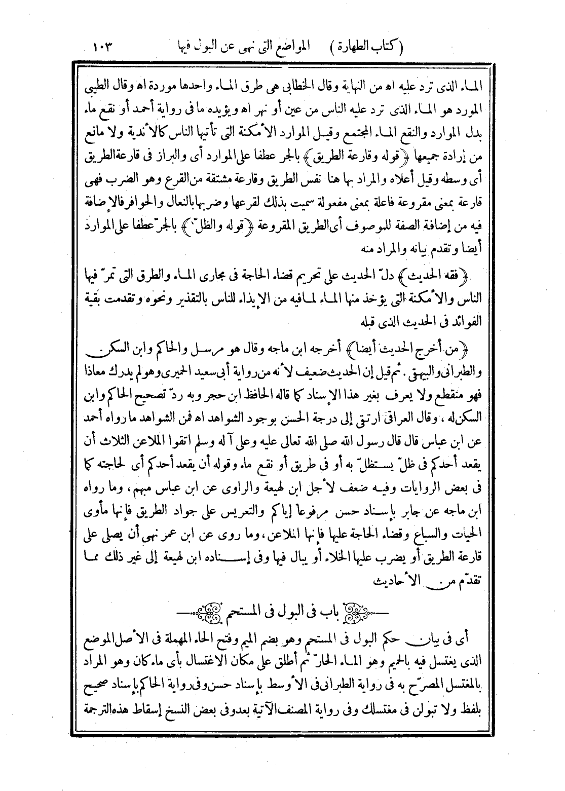 (فقه الحديث) دلّ الحديث على تحريم قضاء الحاجة في مجارى الماء والطرق التى تمرّ فيها الناس والأمكنة التى يؤخذ منها الماء لما فيه من الإيذاء للناس بالتقذير ونحوه وتقدمت بقية الفوائد في الحديث الذى قبله