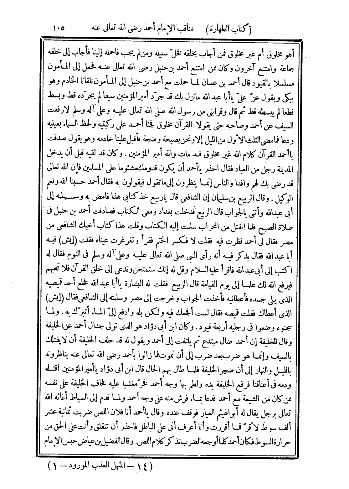أهو مخلوق أم غير مخلوق فمن أجاب بخلقه فخلّ سبيله ومن لم يجب فاحمله إلينا فأجاب إلى خلقه جماعة وامتنع آخرون وكان ممن امتنع أحمد بن حنبل رَضِيَ اللَّهُ تَعَالَى عَنْهُ فحمل إلى المأمون مسلسلا بالقيود قال أحمد بن عسان لما حملت مع أحمد بن حنبل إلى المأمون تلقانا الخادم وهو يبكي ويقول عزّ علىّ يا أبا عبد الله ما نزل بك قد جرّد أمير المؤمنين سيفا لم يجرّده قط وبسط نطعا لم يبسطه قط ثم قال وقرابتى من رسول الله صلى الله تعالى عليه وعلى آله وسلم لارفعت السيف عن أحمد وصاحبة حتى يقولا القرآن مخلوق فجثا أحمد على ركبتيه ولحظ السماء بعينيه ودعا فما مضى الثلث الأول من الليل إلا ونحن بصيحة وضجة فأقبل علينا خادمه وهو يقول صدقت يا أحمد القرآن كلام الله غير مخلوق قد مات والله أمير المؤمنين. وكان قد لقيه قبل أن يدخل المدينة رجل من العباد فقال احذر يا أحمد أن يكون قدومك مشئوما على المسلمين فإن الله تعالى قد رضى بك لهم وافدا والناس إنما ينظرون إلى ما تقول فيقولون به فقال أحمد حسبنا الله ونعم الوكيل. وقال الربيع بن سليمان إن الشافعى قال يا ربيع خذ كتابى هذا فامض به وسلمه إلى أبى عبد الله وأتنى بالجواب قال الربيع فدخلت بغداد ومعى الكتاب فصادفت أحمد في حنبل في صلاة الصبح فلما انفتل من المحراب سلمت إليه الكتاب وقلت هذا كتاب أخيك الشافعى من مصر فقال لى أحمد نظرت فية فقلت لا فكسر الختم فقرأ وتغرغرت عيناه فقلت (إيش) فيه أبا عبد الله فقال يذكر فيه أنه رأى النبى صلى الله تعالى عليه وعلى آله وسلم في النوم فقال له اكتب إلى أبى عبد الله فاقرأ عليه السلام وقل له إنك ستمتحن وتدعى إلى خلق القرآن فلا تجبهم فيرفع الله لك علما إلى يوم القيامة قال الربيع فقلت له البشارة يا أبا عبد الله فخلع أحد قميصيه الذى يلى جسده فأعطانيه فأخذت الجواب وخرجت إلى مصر وسلمته إلى الشافعى فقال (إيش) الذى أعطاك فقلت قميصه فقال لست أفجعك فيه ولكن بله وادفع إليّ الماء أتبرّك به. ولما سجنوه وضعوا في رجليه أربعة قيود. وكان ابن أبى دؤاد هو الذى تولى جدال أحمد عن الخليفة وقال للخليفة إن أحمد ضال مبتدع ثم يلتفت إلى أحمد ويقول له قد حلف الخليفة أن لا يقتلك بالسيف وإنما هو ضرب بعد ضرب إلى أن تموت فما زالوا بأحمد رَضِيَ اللَّهُ تَعَالَى عَنْهُ يناظرونه بالليل والنهار إلى أن ضجر الخليفة فلما طال بهم الحال قال ابن أبى دؤاد يا أمير المؤمنين اقتله ودمه في أعناقنا فرفع الخليفة يده ولطم بها وجه أحمد فخرّ مغشيا عليه فخاف الخليفة على نفسه ممن كان من الشيعة مع أحمد فدعا بماء فرش منه على وجه أحمد ولما قدم إلى السياط أغاثه الله تعالى برجل يقال له أبو الهيثم العيار فوقف عنده وقال يا أحمد أنا فلان اللص ضربت ثمانية عشر ألف سوط لأقرّ فما أقررت وأنا أعرف أنى على الباطل فاحذر أن تتقلق وأنت على الحق من حرارة السوط فكان أحمد كلما أوجعه الضرب تذكر كلام اللص. وقال الفضيل بن عياض حبس الإمام