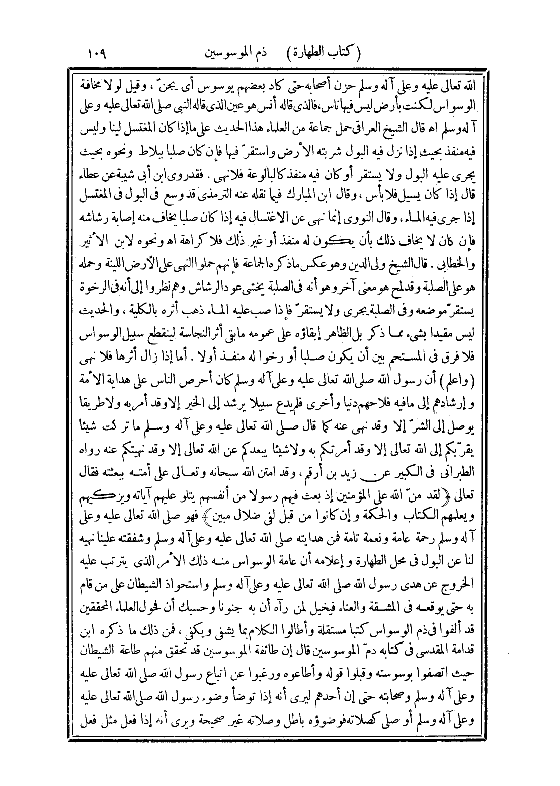 الله تعالى عليه وعلى آله وسلم حزن أصحابه حتى كاد بعضهم يوسوس أى يجنّ، وقيل لولا مخافة الوسواس لكنت بأرض ليس فيها ناس، فالذى قاله أنس هو عين الذى قاله النبى صلى الله تعالى عليه وعلى آله وسلم اهـ قال الشيخ العراقى حمل جماعة من العلماء هذا الحديث على ما إذا كان المغتسل لينا وليس فيه منفذ بحيث إذا نزل فيه البول شربته الأرض واستقرّ فيها فإن كان صلبا ببلاط ونحوه بحيث يجرى عليه البول ولا يستقر أو كان فيه منفذ كالبالوعة فلا نهى. فقد روى ابن أبى شيبة عن عطاء قال إذا كان يسيل فلا بأس، وقال ابن المبارك فيما نقله عنه الترمذي قد وسع في البول في المغتسل إذا جرى فيه الماء، وقال النووى إنما نهى عن الاغتسال فيه إذا كان صلبا يخاف منه إصابة رشاشه فإن كان لا يخاف ذلك بأن يكون له منفذ أو غير ذلك فلا كراهة اه ونحوه لابن الأثير والخطابى. قال الشيخ ولى الدين وهو عكس ما ذكره الجماعة فإنهم حملوا النهى على الأرض اللينة وحمله هو على الصلبة وقد لمح هو معنى آخر وهو أنه في الصلبة يخشى عود الرشاش وهم نظروا إلى أنه في الرخوة يستقرّ موضعه وفى الصلبة بحرى ولا يستقرّ فإذا صب عليه الماء ذهب أثره بالكلية، والحديث ليس مقيدا بشئ مما ذكر بل الظاهر إبقاؤه على عمومه ما بقى أثر النجاسة لينقطع سبيل الوسواس فلا فرق في المستحم بين أن يكون صلبا أو رخوا له منفذ أو لا. أما إذا زال أثرها فلا نهى (واعلم) أن رسول الله صلى الله تعالى عليه وعلى آله وسلم كان أحرص الناس على هداية الأمة وإرشادهم إلى ما فيه فلاحهم دنيا وأخرى فلم يدع سبيلا يرشد إلى الخير إلا وقد أمر به ولا طريقا يوصل إلى الشرّ إلا وقد نهى عنه كما قال صلى الله تعالى عليه وعلى آله وسلم ما تركت شيئا يقربكم إلى الله تعالى إلا وقد أمرتكم به ولا شيئا يبعدكم عن الله تعالى إلا وقد نهيتكم عنه رواه الطبرانى في الكبير عن زيد بن أرقم، وقد امتن الله سبحانه وتعالى على أمته ببعثته فقال تعالى (لقد منّ الله على المؤمنين إذ بعث فيهم رسولا من أنفسهم يتلو عليهم آياته ويزكيهم ويعلمهم الكتاب والحكمة وإن كانوا من قبل لفى ضلال مبين) فهو صلى الله تعالى عليه وعلى آله وسلم رحمة عامة ونعمة تامة فمن هدايته صلى الله تعالى عليه وعلى آله وسلم وشفقته علينا نهيه لنا عن البول في محل الطهارة وإعلامه أن عامة الوسواس منه ذلك الأمر الذى يترتب عليه الخروج عن هدى رسول الله صلى الله تعالى عليه وعلى آله وسلم واستحواذ الشيطان على من قام به حتى يوقعه في المشقة والعناء فيخيل لمن رآه أن به جنونا وحسبك أن فحول العلماء المحققين قد ألفوا في ذم الوسواس كتبا مستقلة وأطالوا الكلام بما يشفى ويكفي، فمن ذلك ما ذكره ابن قدامة المقدسى في كتابه ذمّ الموسوسين قال إن طائفة الموسوسين قد تحقق منهم طاعة الشيطان حيث اتصفوا بوسوسته وقبلوا قوله وأطاعوه ورغبوا عن اتباع رسول الله صلى الله تعالى عليه وعلى آله وسلم وصحابته حتى إن أحدهم ليرى أنه إذا توضأ وضوء رسول الله صلى الله تعالى عليه وعلى آله وسلم أو صلى كصلاته فوضوؤه باطل وصلاته غير صحيحة ويرى أنه إذا فعل مثل فعل