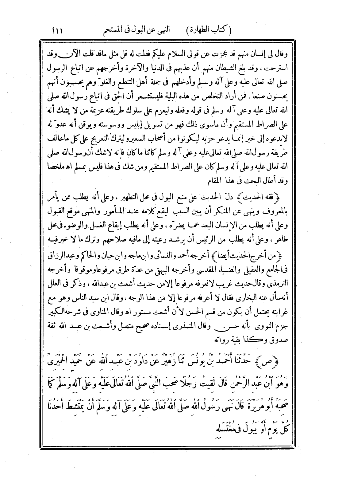 (فقه الحديث) دل الحديث على منع البول في محل التطهير، وعلى أنه يطلب ممن يأمر بالمعروف وينهى عن المنكر أن يبين السبب ليقع كلامه عند المأمور والمنهى موقع القبول وعلى أنه يطلب من الإنسان البعد عما يضرّه، وعلى أنه يطلب إيقاع الغسل والوضوء في محل طاهر، وعلى أنه يطلب من الرئيس أن يرشد رعيته إلى ما فيه صلاحهم وترك ما لا خير فيه (من أخرج الحديث أيضا) أخرجه أحمد والنسائى وابن ماجه وابن حبان والحاكم وعبد الرزاق في الجامع والعقيلى والضياء المقدسى وأخرجه البيهقى من عدّة طرق مرفوعا وموقوفا وأخرجه الترمذى وقال حديث غريب لا نعرفه مرفوعا إلا من حديث أشعث بن عبد الله، وذكر في العلل أنه سأل عنه البخارى فقال لا أعرفه مرفوعا إلا من هذا الوجه، وقال ابن سيد الناس وهو مع غرابته يحتمل أن يكون من قسم الحسن لأن أشعث مستور اهـ وقال المناوى في شرحه الكبير جزم النووى بأنه حسن وقال المنذرى إسناده صحيح متصل وأشعث بن عبد الله ثقة صدوق وكذا بقية رواته