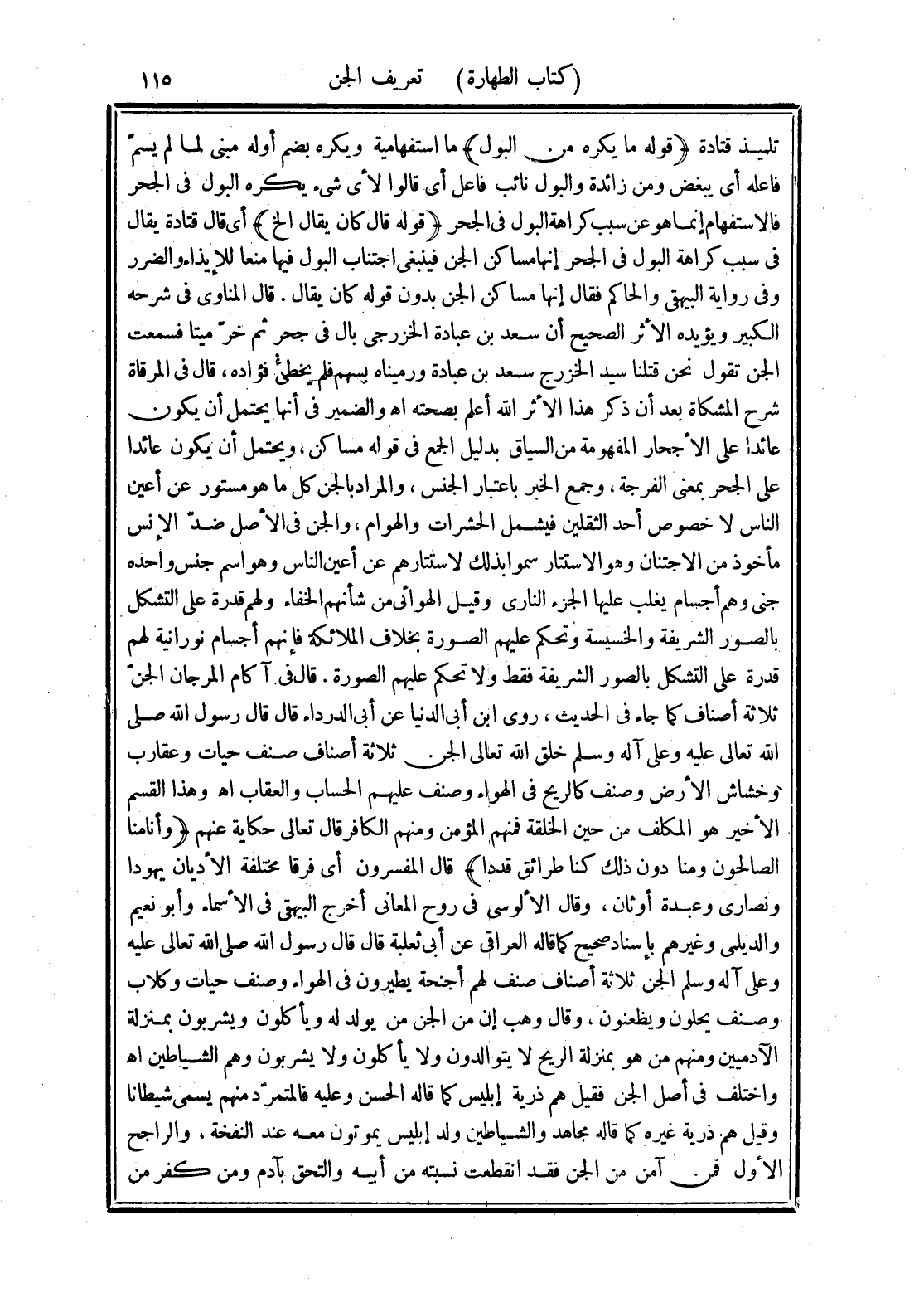 (قوله قال كان يقال الخ) أي قال قتادة يقال في سبب كراهة البول في الجحر إنها مساكن الجن فينبغى اجتناب البول فيها منعا للإيذاء والضرر وفى رواية البيهقى والحاكم فقال إنها مساكن الجن بدون قوله كان يقال. قال المناوى في شرحه الكبير ويؤيده الأثر الصحيح أن سعد بن عبادة الخزرجى بال في جحر ثم خرّ ميتا فسمعت الجن تقول نحن قتلنا سيد الخزرج سعد بن عبادة ورميناه بسهم فلم يخطئ فؤاده، قال في المرقاة شرح المشكاة بعد أن ذكر هذا الأثر الله أعلم بصحته اهـ والضمير في أنها يحتمل أن يكون عائدا على الأجحار المفهومة من السياق بدليل الجمع في قوله مساكن، ويحتمل أن يكون عائدا على الجحر بمعنى الفرجة، وجمع الخبر باعتبار الجنس، والمراد بالجن كل ما هو مستور عن أعين الناس لا خصوص أحد الثقلين فيشمل الحشرات والهوام، والجن في الأصل ضدّ الإنس مأخوذ من الاجتنان وهو الاستتار سموا بذلك لاستتارهم عن أعين الناس وهو اسم جنس واحده جنى وهم أجسام يغلب عليها الجزء النارى وقيل الهوائي من شأنهم الخفاء ولهم قدرة على التشكل بالصور الشريفة والخسيسة وتحكم عليهم الصورة بخلاف الملائكة فإنهم أجسام نورانية لهم قدرة على التشكل بالصور الشريفة فقط ولا تحكم عليهم الصورة. قال في آكام المرجان الجنّ ثلاثة أصناف كما جاء في الحديث، روى ابن أبى الدنيا عن أبى الدرداء قال قال رسول الله صلى الله تعالى عليه وعلى آله وسلم خلق الله تعالى الجن ثلاثة أصناف صنف حيات وعقارب وخشاش الأرض وصنف كالريح في الهواء وصنف عليهم الحساب والعقاب اهـ وهذا القسم الأخير هو المكلف من حين الخلقة فمنهم المؤمن ومنهم الكافر قال تعالى حكاية عنهم (وأنا منا الصالحون ومنا دون ذلك كنا طرائق قددا) قال المفسرون أى فرقا مختلفة الأديان يهودا ونصارى وعبدة أوثان، وقال الألوسى في روح المعاني، أخرج البيهقى في الأسماء وأبو نعيم والديلمى وغيرهم بإسناد صحيح كما قاله العراقى عن أبى ثعلبة قال قال رسول الله صلى الله تعالى عليه وعلى آله وسلم الجن ثلاثة أصناف صنف لهم أجنحة يطيرون في الهواء وصنف حيات وكلاب وصنف يحلون ويظعنون، وقال وهب إن من الجن من يولد له ويأكلون ويشربون بمنزلة الآدميين ومنهم من هو بمنزلة الريح لا يتوالدون ولا يأكلون ولا يشربون وهم الشياطين اهـ واختلف في أصل الجن فقيل هم ذرية إبليس كما قاله الحسن وعليه فالمتمرّد منهم يسمى شيطانا وقيل هم ذرية غيره كما قاله مجاهدا والشياطين ولد إبليس يموتون معه عند النفخة، والراجح الأول فمن آمن من الجن فقد انقطعت نسبته من أبيه والتحق بآدم ومن كفر من