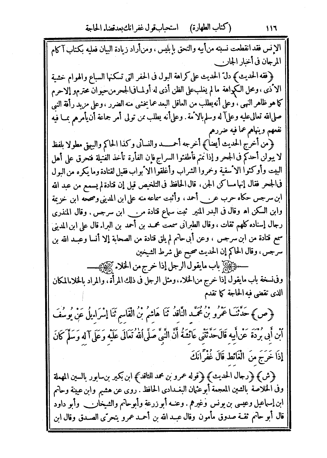 (ص) حَدَّثَنَا عَمْرُو بْنُ مُحَمَّدٍ النَّاقِدُ، ثَنَا هَاشِمُ بْنُ الْقَاسِمِ، ثَنَا إِسْرَائِيلُ، عَنْ يُوسُفَ بْنِ أَبِي بُرْدَةَ، عَنْ أَبِيهِ، حَدَّثَتْنِي عَائِشَةُ رَضِيَ اللَّهُ عَنْهَا، أَنَّ النَّبِيَّ صَلَّى اللهُ تَعَالَى عَلَيْهِ وَعَلَى آلِهِ وسَلَّمَ كَانَ إِذَا خَرَجَ مِنَ الغَائِطِ قَالَ: «غُفْرَانَكَ»