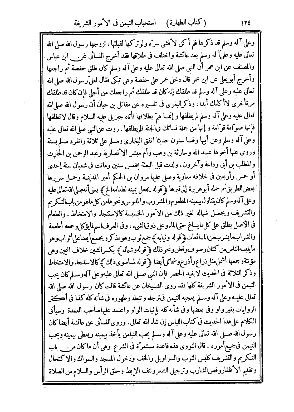 (قوله لما سوى ذلك) كالاستنجاء والامتخاط وذكر الثلاثة في الحديث لا يفيد الحصر فإن النبى صلى الله تعالى عليه وعلى آله وسلم كان يحب التيمن في الأمور الشريفة كلها فقد روى الشيخان عن عائشة قالت كان رسول الله صلى الله تعالى عليه وعلى آله وسلم يعجبه التيمن في ترجله وتنعله وطهوره في شأنه كله كذا في أكثر الروايات بغير واو وفى بعضها وفى شأنه كله بإثبات الواو واعتمد عليها صاحب العمدة وسيأتى الكلام على هذا الحديث في كتاب اللباس إن شاء الله تعالى. وروى النسائى عن عائشة أيضا كان رسول الله صلى الله تعالى عليه وعلى آله وسلم يحب التيامن يأخذ بيمينه ويعطى بيمينه ويحب التيمن في جميع أموره. قال النووى هذه قاعدة مستمرّة في الشرع وهي أن ما كان من باب التكريم والتشريف كلبس الثوب والسراويل والخف ودخول المسجد والسواك والاكتحال وتقليم الأظفار وقص الشارب وترجيل الشعر ونتف الإبط وحلق الرأس والسلام من الصلاة