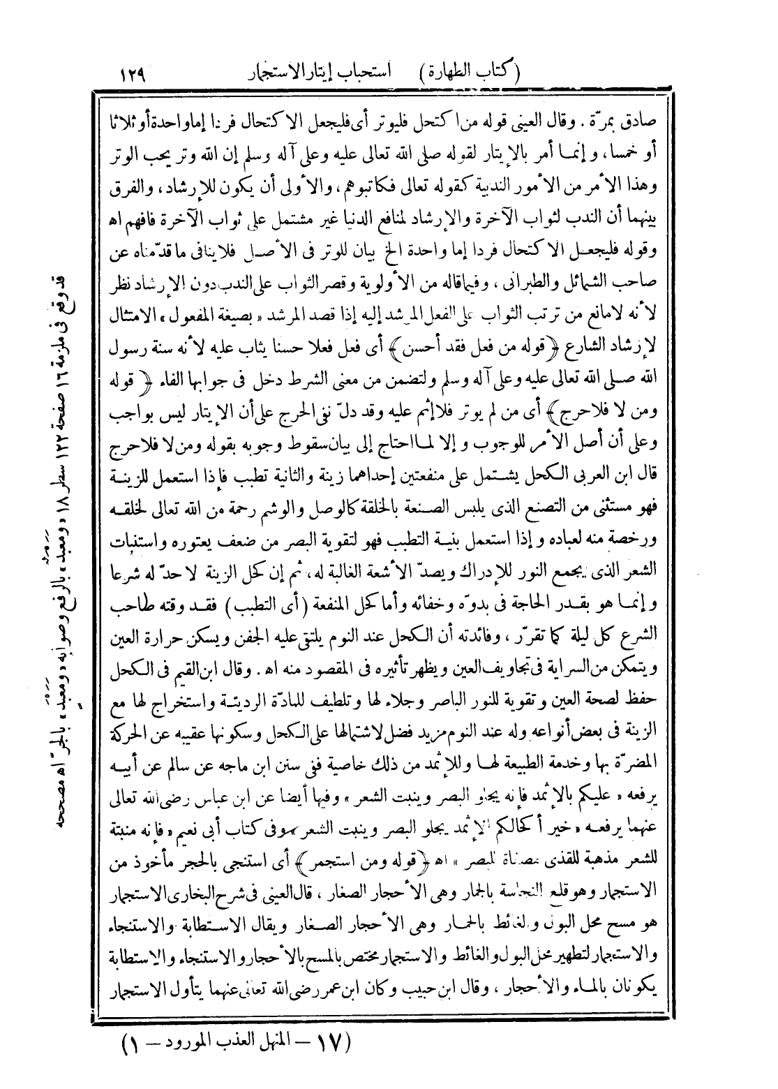 (قوله ومن لا فلا حرج) أى من لم يوتر فلا إثم عليه وقد دلّ نفى الحرج علي أن الإيتار ليس بواجب وعلى أن أصل الأمر للوجوب وإلا لما احتاج إلى بيان سقوط وجوبه بقوله ومن لا فلا حرج قال ابن العربى الكحل يشتمل على منفعتين إحداهما زينة والثانية تطبب فإذا استعمل للزينة فهو مستثنى من التصنع الذى يلبس الصنعة بالخلقة كالوصل والوشم رحمة من الله تعالى لخلقه ورخصة منه لعباده وإذا استعمل بنية التطبب فهو لتقوية البصر من ضعف يعتوره واستنبات الشعر الذى يجمع النور للإدراك ويصدّ الأشعة الغالبة له، ثم إن كحل الزينة لا حدّ له شرعا وإنما هو بقدر الحاجة في بدوّه وخفائه وأما كحل المنفعة (أى التطبب) فقد وقته صاحب الشرع كل ليلة كما تقرّر، وفائدته أن الكحل عند النوم يلتقى عليه الجفن يسكن حرارة العين ويتمكن من السراية في تجاويف العين ويظهر تأثيره في المقصود منه اهـ. وقال ابن القيم في الكحل حفظ لصحة العين وتقوية للنور الباصر وجلاء لها وتلطيف للمادّة الرديّة واستخراج لها مع الزينة في بعض أنواعه وله عند النوم مزيد فضل لاشتمالها على الكحل وسكونها عقيبه عن الحركة المضرّة بها وخدمة الطبيعة لها وللإثمد من ذلك خاصية ففى سنن ابن ماجه عن سالم عن أبيه يرفعه "عليكم بالإثمد فإنه يجلو البصر وينبت الشعر" وفيها أيضا عن ابن عباس رَضِيَ اللَّهُ تَعَالَى عَنْهُما يرفعه "خير أكحالكم الإثمد يجلو البصر وينبت الشعر" وفى كتاب أبى نعيم "فإنه منبتة للشعر مذهبة للقذى مصفاة للبصر" اهـ