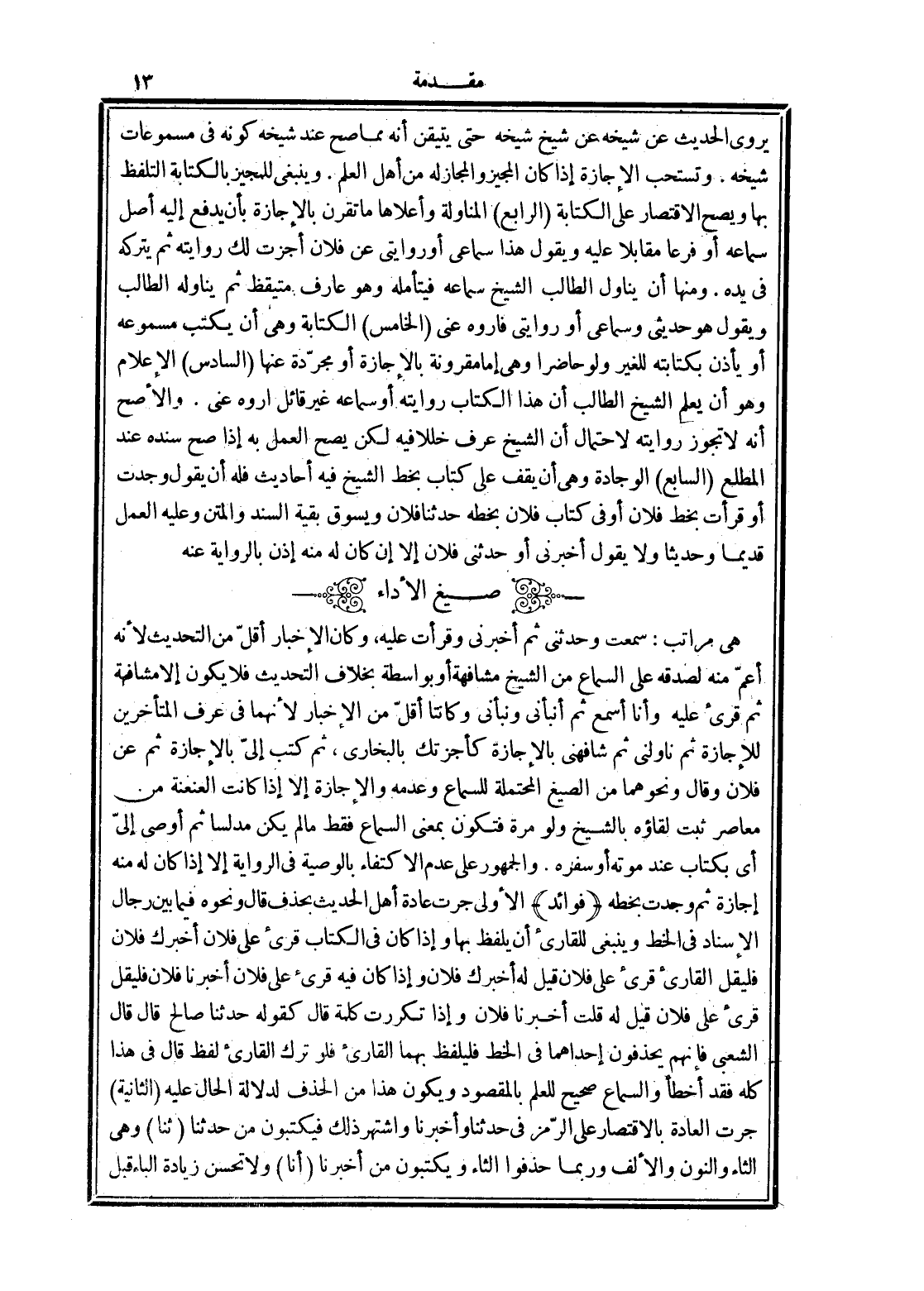 يروى الحديث عن شيخه عن شيخ شيخه حتى يتيقن أنه بما صح عند شيخه كونه في مسموعات شيخة. وتستحب الإجازة إذا كان المجيز والمجاز له من أهل العلم. وينبغى للمجيز بالكتابة التلفظ بها ويصح الاقتصار على الكتابة