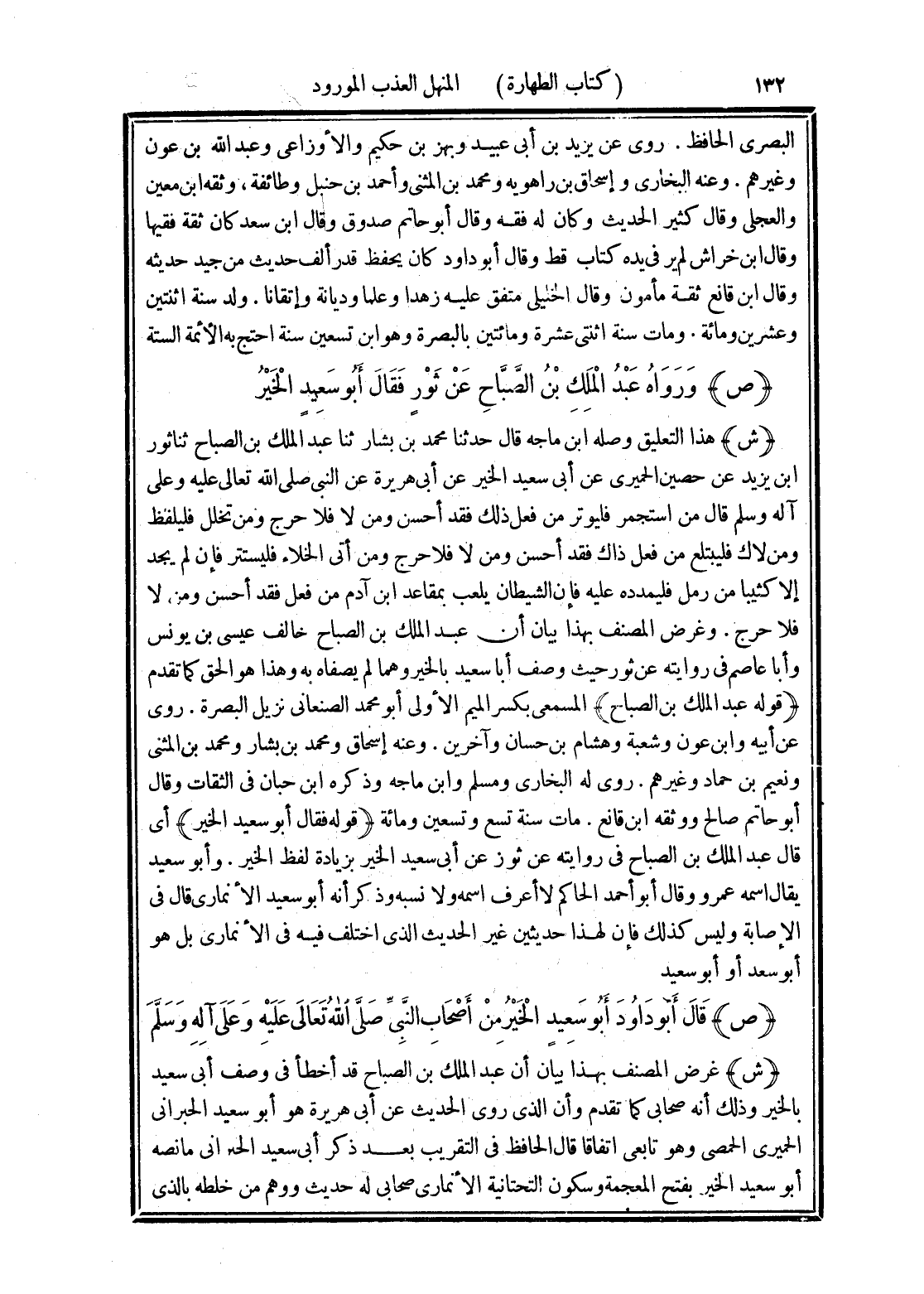 (ش) هذا التعليق وصله ابن ماجه قال حدثنا محمد بن بشار ثنا عبد الملك بن الصباح ثنا ثور ابن يزيد عن حصين الحميرى عن أبى سعيد الخير عن أبى هريرة عن النبى صلى الله تعالى عليه وعلى آله وسلم قال من استجمر فليوتر من فعل ذلك فقد أحسن ومن لا فلا حرج ومن تخلل فليلفظ ومن لاك فليبتلع من فعل ذاك فقد أحسن ومن لا فلا حرج ومن أتى الخلاء فليستتر فإن لم بجد إلا كثيبا من رمل فليمدده عليه فإن الشيطان يلعب بمقاعد ابن آدم من فعل فقد أحسن ومن لا فلا حرج. وغرض المصنف بهذا بيان أن عبد الملك بن الصباح خالف عيسى بن يونس وأبا عاصم في روايته عن ثور حيث وصف أبا سعيد بالخير وهما لم يصفاه به وهذا هو الحق كما تقدم