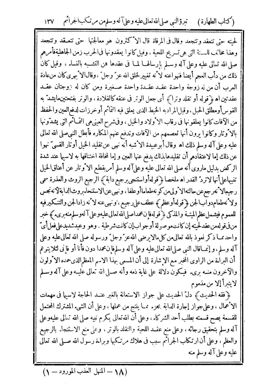 (قوله فإن محمدا صلى الله تعالى عليه وعلى آله وسلم منه برئ) خبر من في قوله من عقد لحيته إن كانت موصولة أو جواب إن كانت شرطية. وهو وعيد شديد على فعل أىّ واحد مما ذكر نعوذ بالله تعالى من كل ما لا يرضى الله عزّ وجلّ ورسوله صلى الله تعالى عليه وعلى آله وسلم، وإنما قال النبى صلى الله تعالى عليه وعلى آله وسلم فإن محمدا دون فأنا أو فإنى لئلا يتوهم أن البراءة من الراوى المخبر مع الإشارة إلى أن المسمى بهذا الاسم المعظم الذى حمده الأولون والآخرون منه برئ فيكون دلالة على غاية ذمه وأنه صلى الله تعالى عليه وعلى آله وسلم لا يتبرأ إلا من مذموم
