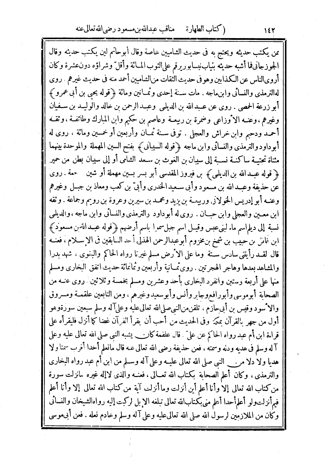 (قوله عبد الله بن مسعود) ابن غافل، بن حبيب بن شمخ بن مخزوم أبو عبد الرحمن الهذلى أحد السابقين في الإسلام، فعنه قال لقد رأيتنى سادس ستة وما على الأرض مسلم غيرنا رواه الحاكم والبغوى، شهد بدرا والمشاهد بعدها وهاجر الهجرتين. روى ثمانية وأربعين وثمانمائة حديث اتفق البخارى ومسلم منها على أربعة وستين وانفرد البخارى بأحد وعشرين ومسلم بخمسة وثلاثين. روى عنه من الصحابة. أبو موسى وأبو رافع وجابر وأنس وأبو سعيد وغيرهم، ومن التابعين علقمة ومسروق والأسود وقيس بن أبى حازم، تلقن من النبى صلى الله تعالى عليه وعلى آله وسلم سبعين سورة وهو أول من جهر بالقرآن بمكة وفى الحديث من أحب أن يقرأ القرآن غضا كما أنزل فليقرأه على قراءة ابن أم عبد رواه الحاكم عن عليّ. قال علقمة كان يشبه النبى صلى الله تعالى عليه وعلى آله وسلم في هديه ودله وسمته، فعن حذيفة رَضِيَ اللَّهُ تَعَالَى عَنْهُ قال ما نعلم أحدا أقرب سمتا ولا هديا ولا دلا من النبى صلى الله تعالى عليه وعلى آله وسلم من ابن أم عبد رواه البخارى والترمذى، وكان أعلم الصحابة بكتاب الله تعالى، فعنه والذى لا إله غيره ما نزلت سورة من كتاب الله تعالى إلا وأنا أعلم أين أنزلت وما أنزلت آية من كتاب الله تعالى إلا وأنا أعلم فيم أنزلت ولو أعلم أحداً أعلم منى بكتاب الله تعالى تبلغه الإبل لركبت إليه رواه الشيخان والنسائى وكان من الملازمين لرسول الله صلى الله تعالى عليه وعلى آله وسلم وخادم نعله. فعن أبي موسى