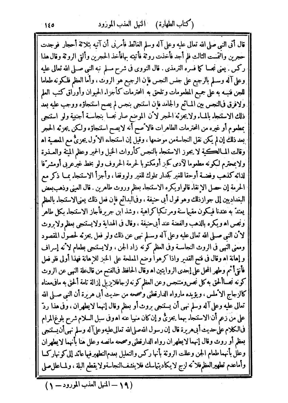 قال أتى النبى صلى الله تعالى عليه وعلى آله وسلم الغائط فأمرنى أن آتيه بثلاثة أحجار فوجدت حجرين والتمست الثالث فلم أجد فأخذت روثة فأتيته بها فأخذ الحجرين وألقى الروثة وقال هذا ركس. يعنى نجسا كما فسره الترمذى. قال النووى في شرح مسلم نبه النبى صلى الله تعالى عليه وعلى آله وسلم بالرجيع على جنس النجس فإن الرجيع هو الروث، وأما العظم فلكونه طعاما للجن فنبه به على جميع المطعومات وتلحق به المحترمات كأجزاء الحيوان وأوراق كتب العلم ولا فرق في النجس بين المائع والجامد فإن استنجى بنجس لم يصح استنجاؤه ووجب عليه بعد ذلك الاستنجاء بالماء ولا يجزئه الحجر لأن الموضع صار نجسا بنجاسة أجنبية ولو استنجى بمطعوم أو غيره من المحترمات الطاهرات فالأصح أنه لا يصح استنجاؤه ولكن يجزئه الحجر بعد ذلك إن لم يكن نقل النجاسة من موضعها، وقيل إن استنجاءه الأول يجزئُ مع المعصية اهـ وقالت المالكية لا يجوز الاستنجاء بالنجس كأرواث الخيل والحمير وعظم الميتة والعذرة ولا بمحترم لكونه مطعوما لآدمى كخبز أو مكتوبا لحرمة الحروف ولو بخط غير عربى أو مشرّفا لذاته كذهب وفضة أو حقا للغير كجدار مملوك للغير ولو وقفا، وأجزأ الاستنجاء بما ذكر مع الحرمة إن حصل الإنقاء قالوا ويكره الاستنجاء بعظم وروث طاهرين. قال العينى وذهب بعض البغداديين إلى جواز ذلك وهو قول أبى حنيفة، وفى البدائع فإن فعل ذلك يعنى الاستنجاء بالعظم يعتدّ به عندنا فيكون مقيما سنة ومرتكبا كراهية، وشذ ابن جرير فأجاز الاستنجاء بكل طاهر ونجس اهـ ويكره بالذهب والفضة عند أبى حنيفة، وقال في الهداية ولا يستنجى بعظم ولا بروث لأن النبى صلى الله تعالى عليه وعلى آله وسلم نهى عن ذلك ولو فعل يجزئه لحصول المقصود ومعنى النهى في الروث النجاسة وفى العظم كونه زاد الجن، ولا يستنجى بطعام لأنه إسراف وإهانة اهـ وقال في فتح القدير واذا كرهوا وضع المملحة على الخبز للإهانة فهذا أولى فلو فعل فأنقى أثم وطهر المحل على إحدى الروايتين اهـ وقال الحافظ في الفتح من قال علة النهى عن الروث كونه نجسا الحق به كل نجس ومتنجس وعن العظم كونه لزجا فلا يزيل إزالة تامة ألحق به ما في معناه كالزجاج الأملس، ويؤيده ما رواه الدارقطنى وصححه من حديث أبى هريرة أن النبى صلى الله تعالى عليه وعلى آله وسلم نهى أن يستنجى بروث أو بعظم وقال إنهما لا يطهران، وفى هذا ردّ على من زعم أن الاستنجاء بهما يجزئُ وإن كان منهيا عنه اهـ وفى سبل السلام شرح بلوغ المرام في الكلام على حديث أبى هريرة قال إن رسول الله صلى الله تعالى عليه وعلى آله وسلم نهى أن يستنجى بعظم أو روث وقال إنهما لا يطهران رواه الدارقطنى وصححه ما نصه وعلل هنا بأنهما لا يطهران وعلل بأنهما طعام الجن وعللت الروثة بأنها ركس والتعليل بعدم التطهير فيها عائد إلى كونها ركسا وأما عدم تطهير العظم فلأنه لزج لا يكاد يتماسك فلا ينشف النجاسة ولا يقطع البلة، ولما علل صلى