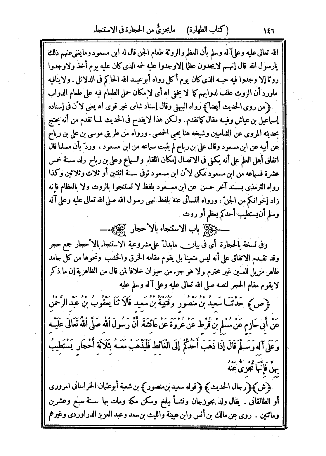 (ص) حَدَّثَنَا سَعِيدُ بْنُ مَنْصُورٍ، وَقُتَيْبَةُ بْنُ سَعِيدٍ، قَالَا: ثَنَا يَعْقُوبُ بْنُ عَبْدِ الرَّحْمَنِ، عَنْ أَبِي حَازِمٍ، عَنْ مُسْلِمِ بْنِ قُرْطٍ، عَنْ عُرْوَةَ، عَنْ عَائِشَةَ، أَنَّ رَسُولَ اللَّهِ صَلَّى اللهُ تَعَالَى عَلَيْهِ وَعَلَى آلِهِ وَسَلَّمَ قَالَ: «إِذَا ذَهَبَ أَحَدُكُمْ إِلَى الْغَائِطِ، فَلْيَذْهَبْ مَعَهُ بِثَلَاثَةِ أَحْجَارٍ يَسْتَطِيبُ بِهِنَّ، فَإِنَّهَا تُجْزِئُ عَنْهُ»