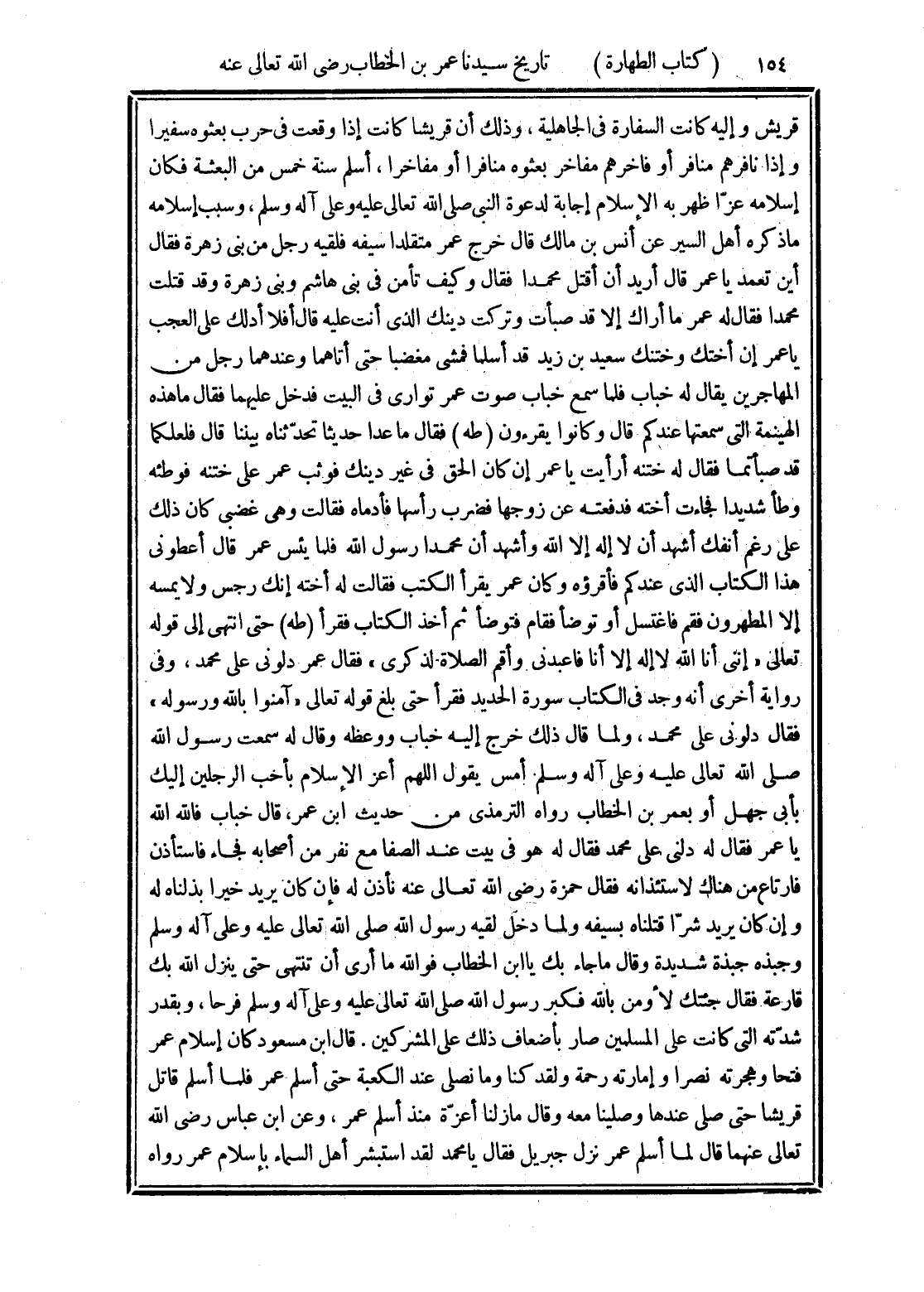 قريش وإليه كانت السفارة في الجاهلية، وذلك أن قريشا كانت إذا وقعت في حرب بعثوه سفيرا وإذا نافرهم منافر أو فاخرهم مفاخر بعثوه منافرا أو مفاخرا، أسلم سنة خمس منن البعثة فكان إسلامه عزّا ظهر به الإسلام إجابة لدعوة النبى صلى الله تعالى عليه وعلى آله وسلم، وسبب إسلامه ما ذكره أهل السير عن أنس بن مالك قال خرج عمر متقلدا سيفه فلقيه رجل من بنى زهرة فقال أين تعمد يا عمر قال أريد أن أقتل محمدا فقال وكيف تأمن في بنى هاشم وبنى زهرة وقد قتلت محمدا فقال له عمر ما أراك إلا قد صبأت وتركت دينك الذى أنت عليه قال أفلا أدلك على العجب يا عمر إن أختك وختنك سعيد بن زيد قد أسلما فمشى مغضبا حتى أتاهما وعندهما رجل من المهاجرين يقال له خباب فلما سمع خباب صوت عمر توارى في البيت فدخل عليهما فقال ما هذه الهينمة التى سمعتها عندكم قال وكانوا يقرءون (طه) فقال ما عدا حديثا تحدّثناه بيننا قال فلعلكما قد صبأتما فقال له ختنه أرأيت يا عمر إن كان الحق في غير دينك فوثب عمر على ختنه فوطئه وطأ شديدا فجاءت أخته فدفعته عن زوجها فضرب رأسها فأدماه فقالت وهي غضبى كان ذلك على رغم أنفك أشهد أن لا إله إلا الله وأشهد أن محمدا رسول الله فلما يئس عمر قال أعطوني هذا الكتاب الذى عندكم، فأقرؤه وكان عمر يقرأ الكتب فقالت له أخته إنك رجس ولا يمسه إلا المطهرون فقم فاغتسل أو توضأ فقام فتوضأ ثم أخذ الكتاب فقرأ (طه) حتى انتهى إلى قوله تعالى "إننى أنا الله لا إله إلا أنا فاعبدنى وأقم الصلاة لذكرى" فقال عمر دلوني على محمد، وفى رواية أخرى أنه وجد في الكتاب سورة الحديد فقرأ حتى بلغ قوله تعالى "آمنوا بالله ورسوله" فقال دلونى على محمد، ولما قال ذلك خرج إليه خباب ووعظه وقال له سمعت رسول الله صلى الله تعالى عليه وعلى آله وسلم أمس يقول اللهم أعز الإسلام بأحب الرجلين إليك بأبى جهل أو بعمر بن الخطاب رواه الترمذى من حديث ابن عمر، قال خباب فالله الله يا عمر فقال له دلنى على محمد فقال له هو في بيت عند الصفا مع نفر من أصحابه فجاء فاستأذن فارتاع من هناك لاستئذانه فقال حمزة رَضِيَ اللَّهُ تَعَالَى عَنْهُ نأذن له فإن كان يريد خيرا بذلناه له وإن كان يريد شرّا قتلناه بسيفه ولما دخل لقيه رسول الله صلى الله تعالى عليه وعلى آله وسلم وجبذه جبذة شديدة وقال ما جاء بك يا ابن الخطاب فوالله ما أرى أن تنتهى حتى ينزل الله بك قارعة فقال جئتك لأومن بالله فكبر رسول الله صلى الله تعالى علية وعلى آله وسلم فرحا، وبقدر شدّته التى كانت على المسلمين صار بأضعاف ذلك على المشركين. قال ابن مسعود كان إسلام عمر فتحا وهجرته نصرا وإمارته رحمة ولقد كنا وما نصلى عند الكعبة حتى أسلم عمر فلما أسلم قاتل قريشا حتى صلى عندها وصلينا معه وقال ما زلنا أعزّة منذ أسلم عمر، وعن ابن عباس رَضِيَ اللَّهُ تَعَالَى عَنْهُما قال لما أسلم عمر نزل جبريل فقال يا محمد لقد استبشر أهل السماء بإسلام عمر رواه