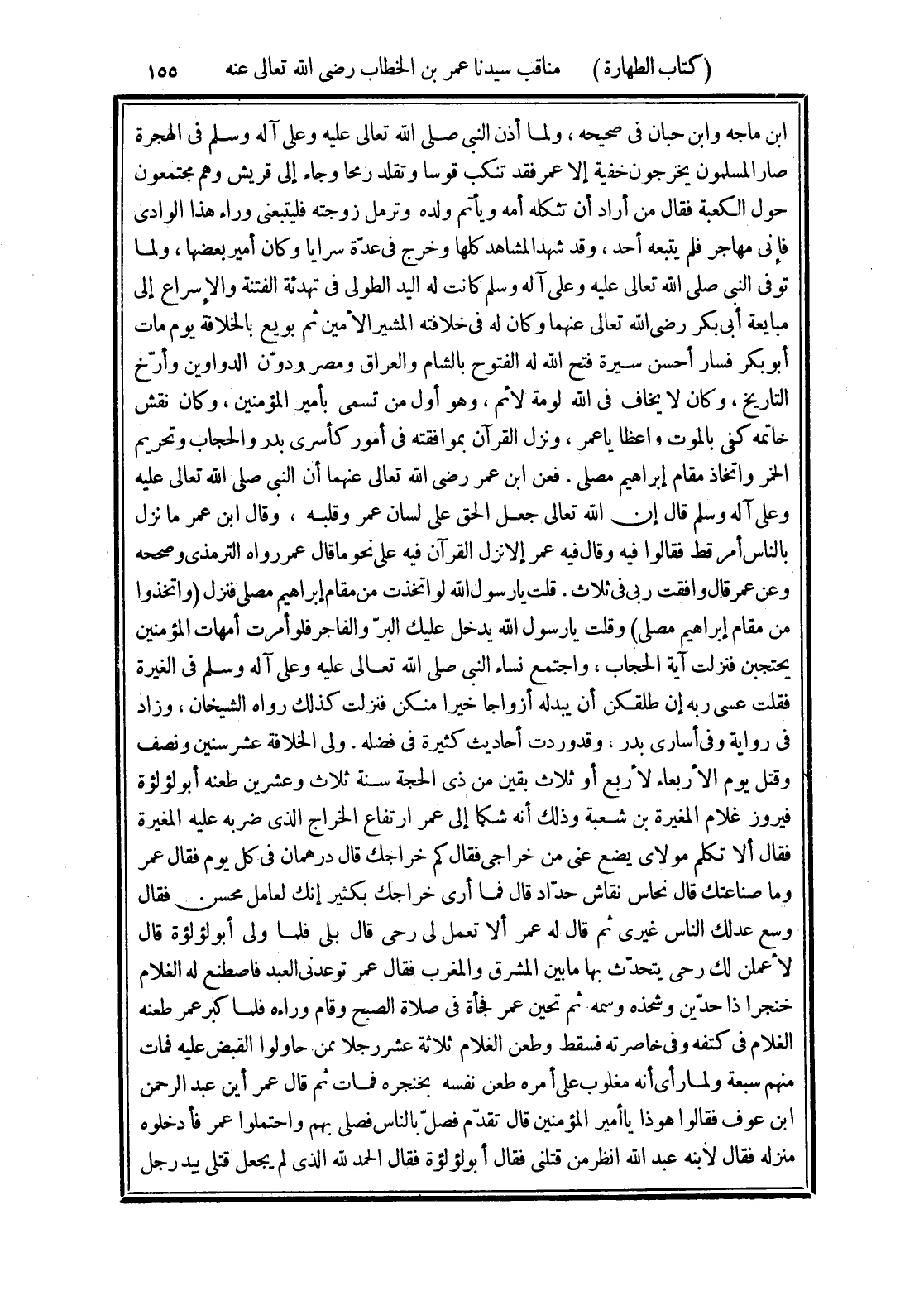 ابن ماجه وابن حبان في صحيحه، ولما أذن النبى صلى الله تعالى عليه وعلى آله وسلم في الهجرة صار المسلمون يخرجون خفية إلا عمر فقد تنكب قوسا وتقلد رمحا وجاء إلى قريش وهم مجتمعون حول الكعبة فقال من أراد أن تثكله أمه ويأتم ولده وترمل زوجته فليتبعنى وراء هذا الوادى فإنى مهاجر فلم يتبعه أحد، وقد شهد المشاهد كلها وخرج في عدّة سرايا وكان أمير بعضها، ولما توفى النبى صلى الله تعالى عليه وعلى آله وسلم كانت له اليد الطولى في تهدئة الفتنة والإسراع إلى مبايعة أبى بكر رَضِيَ اللَّهُ تَعَالَى عَنْهُما وكان له في خلافته المشير الأمين ثم بويع بالخلافة يوم مات أبو بكر فسار أحسن سيرة فتح الله له الفتوح بالشام والعراق ومصر ودوّن الدواوين وأرّخ التاريخ، وكان لا يخاف في الله لومة لائم، وهو أول من تسمى بأمير المؤمنين، وكان نقش خاتمه كفى بالموت واعظا يا عمر، ونزل القرآن بموافقته في أمور كأسرى بدر والحجاب وتحريم الخمر واتخاذ مقام إبراهيم مصلى. فعن ابن عمر رَضِيَ اللَّهُ تَعَالَى عَنْهُما أن النبى صلى الله تعالى عليه وعلى آله وسلم قال إن الله تعالى جعل الحق على لسان عمر وقلبه، وقال ابن عمر ما نزل بالناس أمر قط فقالوا فيه وقال فيه عمر إلا نزل القرآن فيه على نحو ما قال عمر رواه الترمذى وصححه وعن عمر قال وافقت ربى ثلاث. قلت يا رسول الله لو اتخذت من مقام إبراهيم مصلى فنزل (واتخذوا من مقام إبراهيم مصلى) وقلت يا رسول الله يدخل عليك البرّ والفاجر فلو أمرت أمهات المؤمنين يحتجبن فنزلت آية الحجاب، واجتمع نساء النبى صلى الله تعالى عليه وعلى آله وسلم في الغيرة فقلت عسى ربه إن طلقكن أن يبدله أزواجا خيرا منكن فنزلت كذلك رواه الشيخان، وزاد في رواية وفى أسارى بدر، وقد وردت أحاديث كثيرة في فضله. ولى الخلافة عشر سنين ونصف وقتل يوم الأربعاء لأربع أو ثلاث بقين من ذى الحجة سنة ثلاث وعشرين طعنه أبو لؤلؤة فيروز غلام المغيرة بن شعبة وذلك أنه شكا إلى عمر ارتفاع الخراج الذى ضربه عليه المغيرة فقال ألا تكلم مولاى يضع عنى من خراجى فقال كم خراجك قال درهمان في كل يوم فقال عمر وما صناعتك قال نحاس نقاش حدّاد قال فما أرى خراجك بكثير إنك لعامل محسن فقال وسع عدلك الناس غيرى ثم قال له عمر ألا تعمل لى رحى قال بلى فلما ولى أبو لؤلؤة قال لأعملن لك رحى يتحدّث بها ما بين المشرق والمغرب فقال عمر توعدنى العبد فاصطنع له الغلام خنجرا ذا حدّين وشحذه وسمه تم تحين عمر فجأة في صلاة الصبح وقام وراءه فلما كبر عمر طعنه الغلام في كتفه وفى خاصرته فسقط وطعن الغلام ثلاثة عشر رجلا ممن حاولوا القبض عليه فمات منهم سبعة ولما رأى أنه مغلوب على أمره طعن نفسه بخنجره فمات ثم قال عمر أين عبد الرحمن ابن عوف فقالوا هو ذا يا أمير المؤمنين قال تقدم فصلّ بالناس فصلى بهم واحتملوا عمر فأدخلوه منزله فقال لابنه عبد الله انظر من قتلنى فقال أبو لؤلؤة فقال الحمد لله الذى لم يجعل قتلى بيد رجل