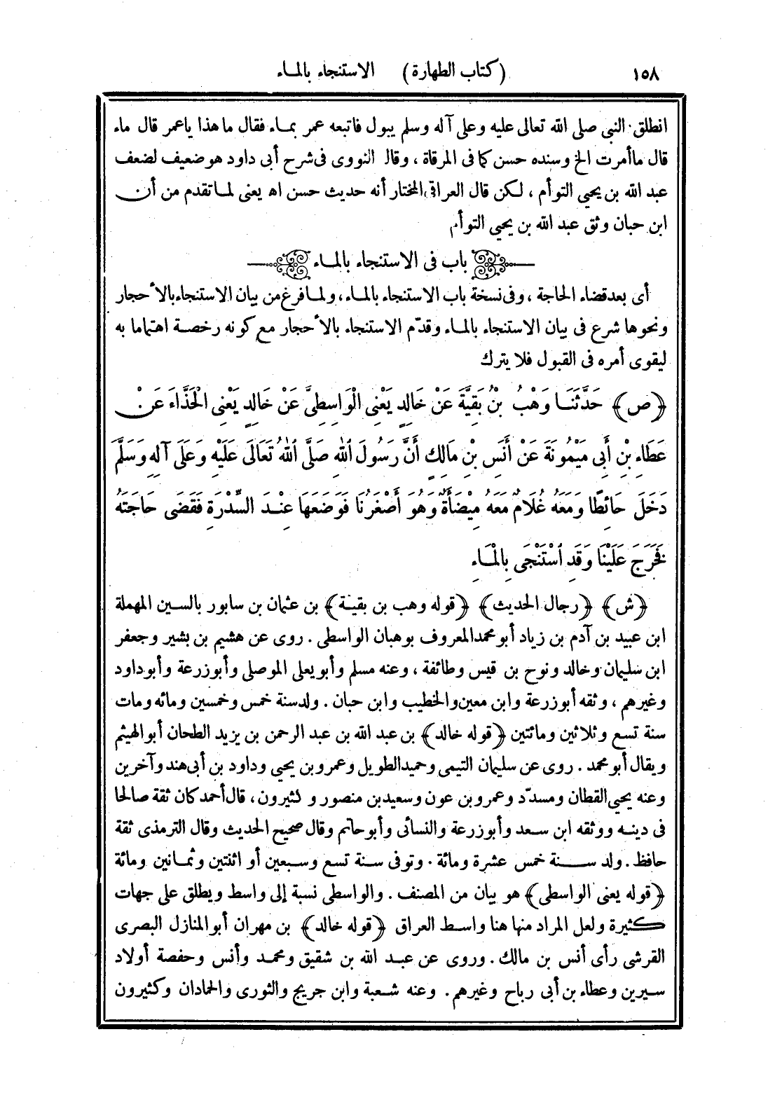 (ص) حَدَّثَنَا وَهْبُ بْنُ بَقِيَّةَ، عَنْ خَالِدٍ يَعْنِي الْوَاسِطِيَّ، عَنْ خَالِدٍ يَعْنِي الْحَذَّاءَ، عَنْ عَطَاءِ بْنِ أَبِي مَيْمُونَةَ، عَنْ أَنَسِ بْنِ مَالِكٍ، «أَنَّ رَسُولَ اللَّهِ صَلَّى اللهُ تَعَالَى عَلَيْهِ وَعَلَى آلِهِ وسَلَّمَ دَخَلَ حَائِطًا، وَمَعَهُ غُلَامٌ مَعَهُ مِيضَأَةٌ، وَهُوَ أَصْغَرُنَا فَوَضَعَهَا عِنْدَ السِّدْرَةِ، فَقَضَى حَاجَتَهُ، فَخَرَجَ عَلَيْنَا وَقَدْ اسْتَنْجَى بِالْمَاءِ»
