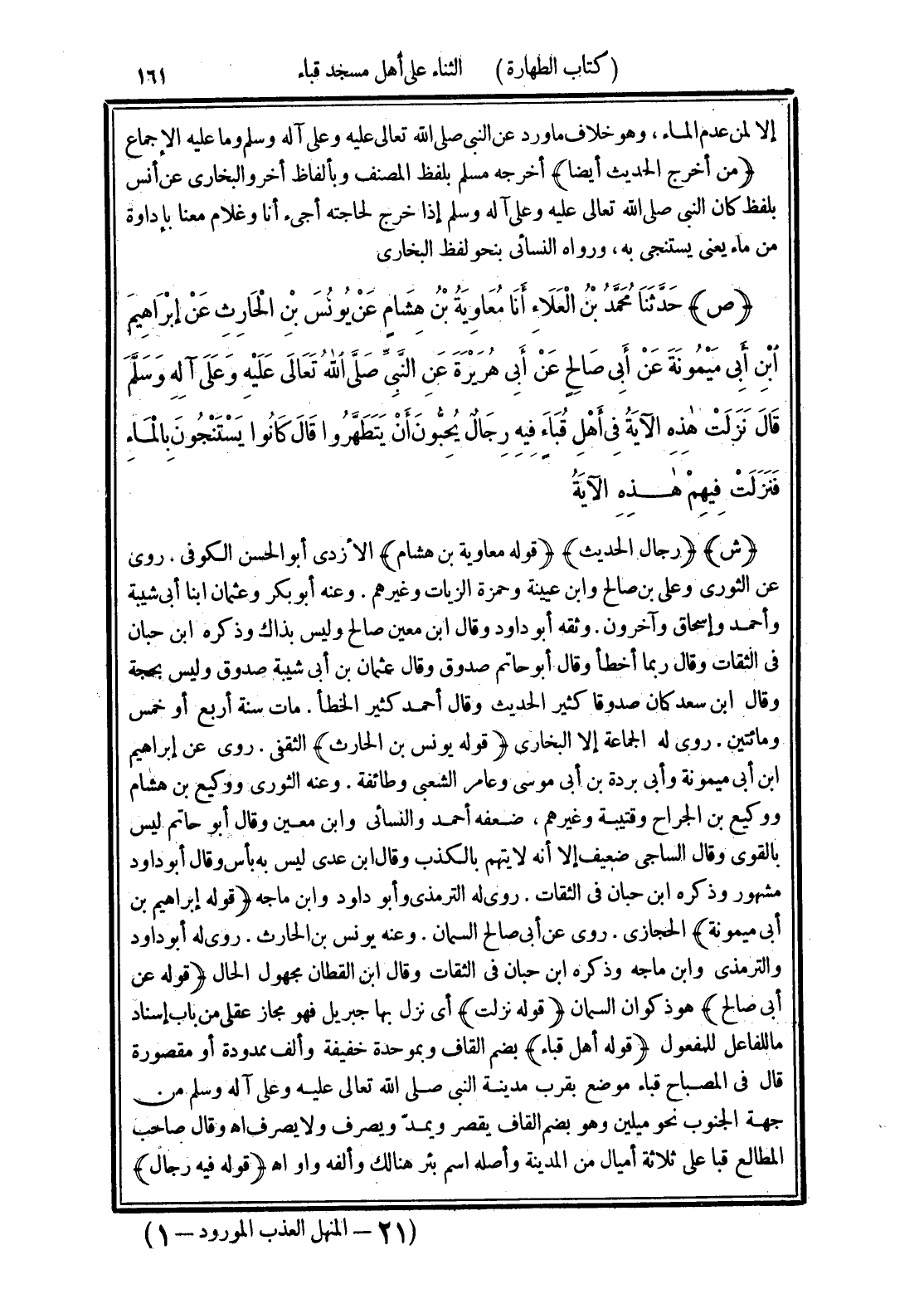 (ص) حَدَّثَنَا مُحَمَّدُ بْنُ الْعَلَاءِ، أَنَا مُعَاوِيَةُ بْنُ هِشَامٍ، عَنْ يُونُسَ بْنِ الْحَارِثِ، عَنْ إِبْرَاهِيمَ بْنِ أَبِي مَيْمُونَةَ، عَنْ أَبِي صَالِحٍ، عَنْ أَبِي هُرَيْرَةَ، عَنِ النَّبِيِّ صَلَّى اللهُ تَعَالَى عَلَيْهِ وَعَلَى آلِهِ وسَلَّمَ، قَالَ: " نَزَلَتْ هَذِهِ الْآيَةُ فِي أَهْلِ قُبَاءٍ: {فِيهِ رِجَالٌ يُحِبُّونَ أَنْ يَتَطَهَّرُوا} [التوبة: 108] "، قَالَ: «كَانُوا يَسْتَنْجُونَ بِالْمَاءِ، فَنَزَلَتْ فِيهِمْ هَذِهِ الْآيَةُ»