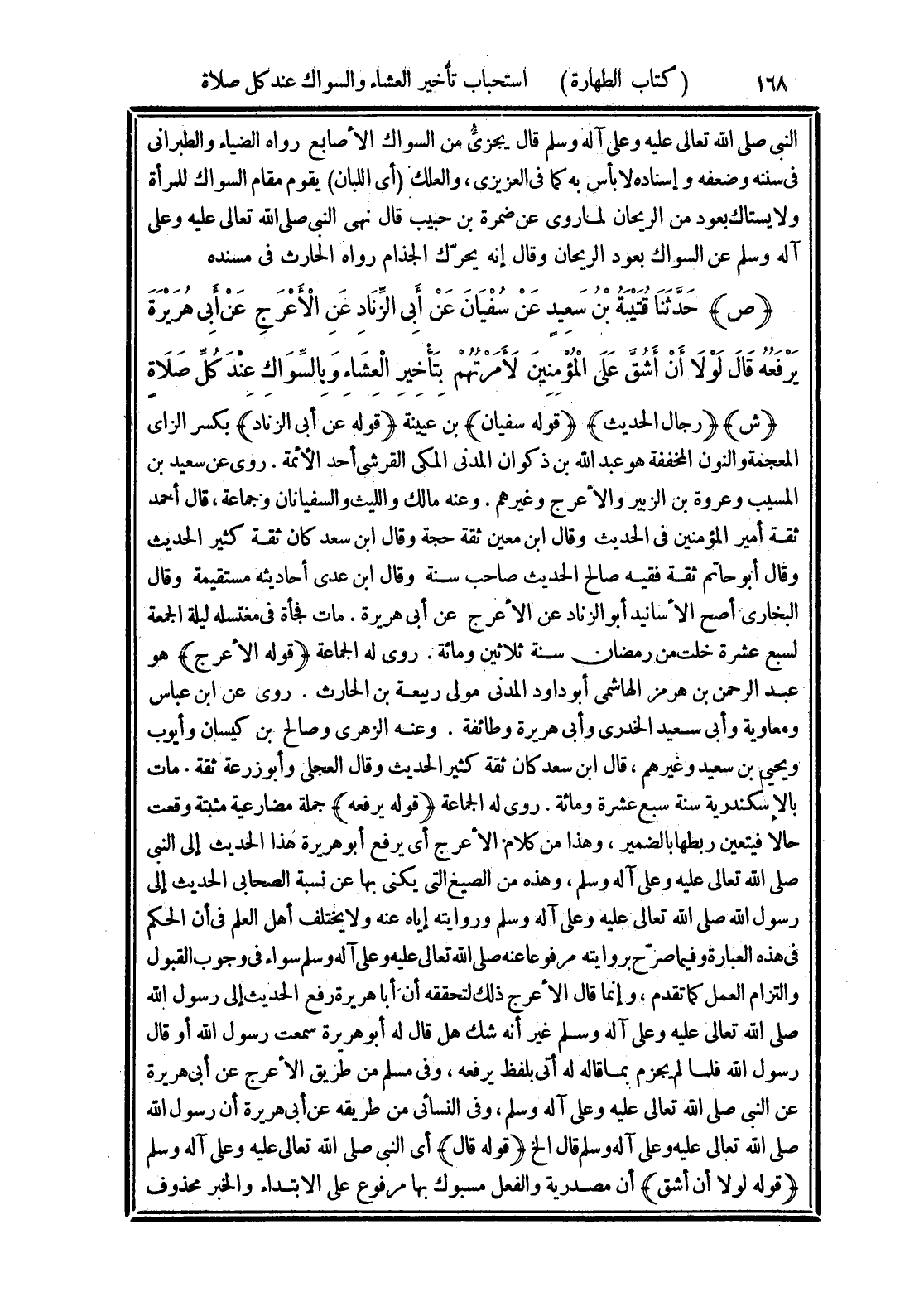 (ص) حَدَّثَنَا قُتَيْبَةُ بْنُ سَعِيدٍ، عَنْ سُفْيَانَ، عَنْ أَبِي الزِّنَادِ، عَنِ الْأَعْرَجِ، عَنْ أَبِي هُرَيْرَةَ، يَرْفَعُهُ، قَالَ: «لَوْلَا أَنْ أَشُقَّ عَلَى الْمُؤْمِنِينَ، لَأَمَرْتُهُمْ بِتَأْخِيرِ الْعِشَاءِ، وَبِالسِّوَاكِ عِنْدَ كُلِّ صَلَاةٍ»