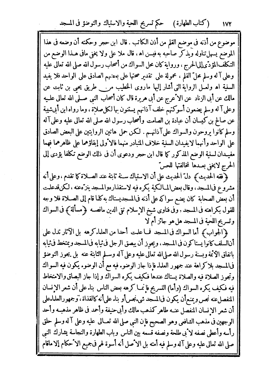 (الجواب) أما السواك في المسجد فما علمت أحدا من العلماء كرهه بل الآثار تدل على أن السلف كانوا يستاكون في المسجد، ويجوز أن يبصق الرجل في ثيابه في المسجد ويتمخط في ثيابه باتفاق الأئمة وبسنة رسول الله صلى الله تعالى عليه وعلى آله وسلم الثابتة عنه بل يجوز التوضؤ في المسجد بلا كراهة عند جمهور العلماء فإذا جاز الوضوء فيه مع أن الوضوء يكون فيه السواك وتجوز الصلاة فيه والصلاة يستاك عندها فكيف يكره السواك وإذا جاز البصاق والامتخاط فيه فكيف يكره السواك (وأما) التسريح فإنما. كرهه بعض الناس بناء على أن شعر الإنسان المنفصل عنه نجس ويمنع أن يكون في المسجد شئ نجس أو بناء على أنه كالقذاة، وجمهور العلماء على أن شعر الإنسان المنفصل عنه طاهر كمذهب مالك وأبى حنيفة وأحمد في ظاهر مذهبه وأحد الوجهين في مذهب الشافعى وهو الصحيح فإن النبى صلى الله تعالى عليه وعلى آله وسلم حلق رأسه وأعطى نصفه لأبى طلحة ونصفه قسمه بين الناس وباب الطهارة والنجاسة يشارك النبى صلى الله تعالى عليه وعلى آله وسلم فيه أمته بل الأصل أنه أسوة لهم في جميع الأحكام إلا ما قام