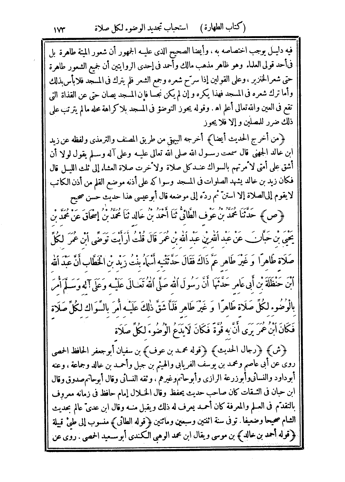 (ص) حَدَّثَنَا مُحَمَّدُ بْنُ عَوْفٍ الطَّائِيُّ، ثَنَا أَحْمَدُ بْنُ خَالِدٍ، ثَنَا مُحَمَّدُ بْنُ إِسْحَاقَ، عَنْ مُحَمَّدِ بْنِ يَحْيَى بْنِ حَبَّانَ، عَنْ عَبْدِ اللَّهِ بْنِ عَبْدِ اللَّهِ بْنِ عُمَرَ، قَالَ: قُلْتُ: أَرَأَيْتَ تَوضِّي ابْنِ عُمَرَ لِكُلِّ صَلَاةٍ طَاهِرًا، وَغَيْرَ طَاهِرٍ، عَمَّ ذَاكَ؟ فَقَالَ: حَدَّثَتْنِيهِ أَسْمَاءُ بِنْتُ زَيْدِ بْنِ الْخَطَّابِ، أَنَّ عَبْدَ اللَّهِ بْنَ حَنْظَلَةَ بْنِ أَبِي عَامِرٍ، حَدَّثَهَا «أَنَّ رَسُولَ اللَّهِ صَلَّى اللهُ تَعَالَى عَلَيْهِ وَعَلَى آلِهِ وسَلَّمَ أُمِرَ بِالْوُضُوءِ لِكُلِّ صَلَاةٍ، طَاهِرًا وَغَيْرَ طَاهِرٍ، فَلَمَّا شَقَّ ذَلِكَ عَلَيْهِ، أُمِرَ بِالسِّوَاكِ لِكُلِّ صَلَاةٍ»، فَكَانَ ابْنُ عُمَرَ يَرَى أَنَّ بِهِ قُوَّةً، فَكَانَ لَا يَدَعُ الْوُضُوءَ لِكُلِّ صَلَاةٍ