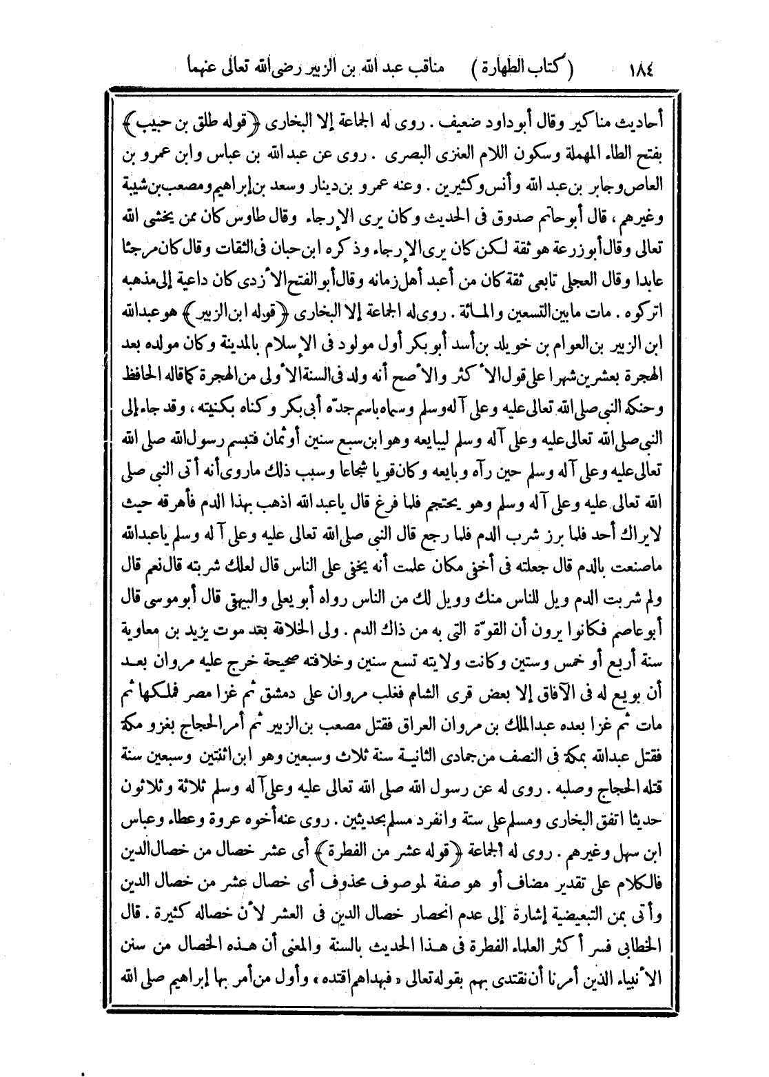 (قوله ابن الزبير) هو عبد الله ابن الزبير بن العوام بن خويلد بن أسد أبو بكر أول مولود في الإسلام بالمدينة وكان مولده بعد الهجرة بعشرين شهرا على قول الأكثر والأصح أنه ولد في السنة الأولى من الهجرة كما قاله الحافظ وحنكه النبي صلى الله اتعالى عليه وعلى آله وسلم وسماه باسم جدّه أبي بكر وكناه بكنيته، وقد جاء إلى النبي صلى الله تعالى عليه وعلى آله وسلم ليبايعه وهو ابن سبع سنين أو ثمان فتبسم رسول الله صلى الله تعالى عليه وعلى آله وسلم حين رآه وبايعه وكان قويا شجاعا وسبب ذلك ما روى أنه أتى النبي صلى الله تعالى عليه وعلى آله وسلم وهو يحتجم فلما فرغ قال يا عبد الله اذهب بهذا الدم فأهرقه حيث لا يراك أحد فلما برز شرب الدم فلما رجع قال النبي صلى الله تعالى عليه وعلى آله وسلم يا عبد الله ما صنعت بالدم قال جعلته في أخفى مكان علمت أنه يخفى على الناس قال لعلك شربته قال نعم قال ولم شربت الدم ويل للناس منك وويل لك من الناس رواه أبو يعلى والبيهقي قال أبو موسى قال أبو عاصم فكانوا يرون أن القوّة التي به من ذاك الدم. ولي الخلافة بعد موت يزيد بن معاوية سنة أربع أو خمس وستين وكانت ولايته تسع سنين وخلافته صحيحة خرح عليه مروان بعد أن بويع له في الآفاق إلا بعض قرى الشام فغلب مروان على دمشق ثم غزا مصر فملكها ثم مات ثم غزا بعده عبد الملك بن مران العراق فقتل مصعب بن الزبير ثم أمر الحجاج بغزو مكة فقتل عبد الله بمكة في النصف من جمادى الثانية سنة ثلاث وسبعين وهو ابن اثنتين وسبعين سنة قتله الحجاج وصلبه. روى له عن رسول الله صلى الله تعالى عليه وعلى آله وسلم ثلاثة وثلاثون حديثا اتفق البخارى ومسلم على ستة وانفرد مسلم بحديثين. روى عنه أخوه عروة وعطاء وعباس ابن سهل وغيرهم. روى له الجماعة